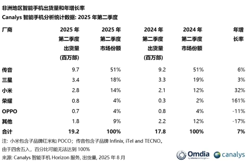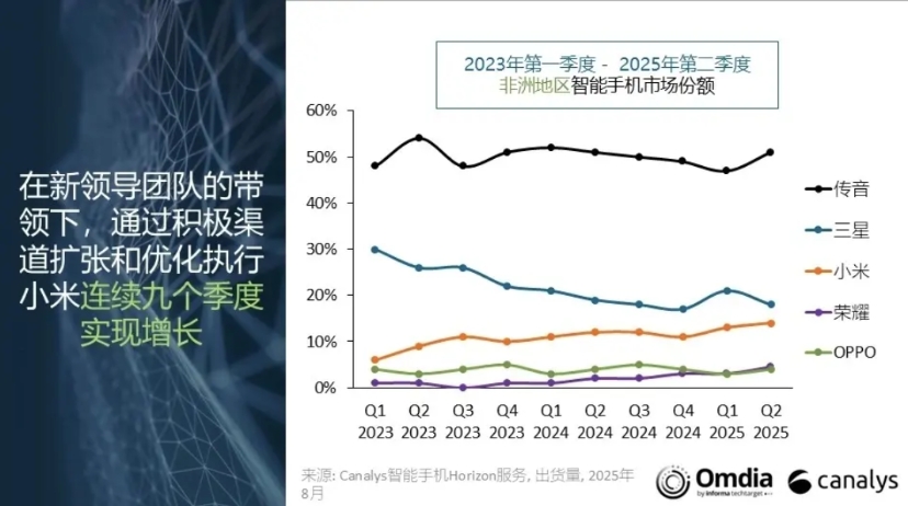 看来雷军派到非洲的高管是真正有实力的干将,而不是“水货”,Omdia刚发布了25Q2非洲市场的详细版研报,得出了十分有力的结论——“在新领导团队的带领下,通过积极渠道扩张和优化执行,小米连续9个季度实现增长!”