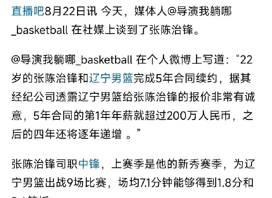 辽宁男篮有诚意!B类合同薪资这么高吗? 张陈治锋和辽宁男篮达成B类最长的5年期合