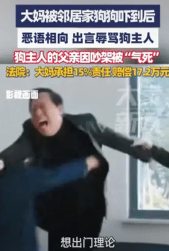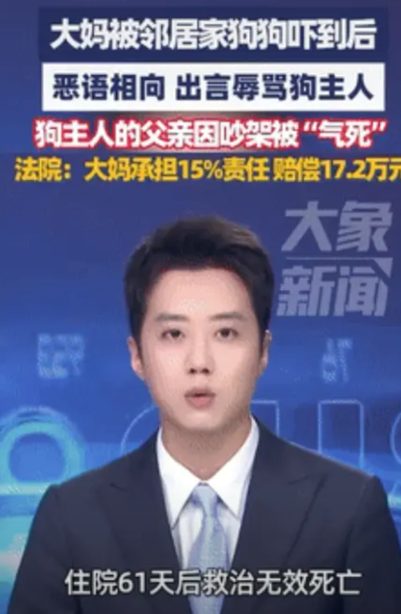 “冤不冤?”江苏宜兴,大妈出门被邻居的狗吓了一跳,于是就骂了狗主人,狗主人的父亲也准备上前对骂,不料大爷一激动竟然晕倒了,送到医院住院61天竟然去世了,狗主人认为都是大妈造成的,于是将她告上了法庭,法院是这么判的。