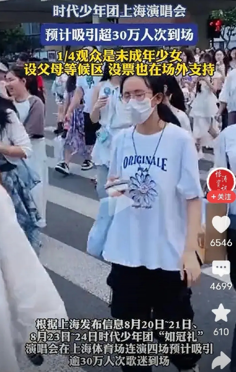 时代少年团上海演唱会,疯狂: 第1、4场演唱会,现场观众30万。 第2、内场门票1880元,看台门票980、480元。如果均价1000元,票房3亿,这比制造汽车赚钱。 第3、1/4观众是未成年少女,看看视频,估计观众99%是女性。 第4、看了7个演员,类似于韩国男团,这就是现在女孩喜欢的偶像。 第5、售票太快,几分钟票被抢完,市场太大了。 第6、这些女孩将来嫁人,不知道会不会看上普通打工族?