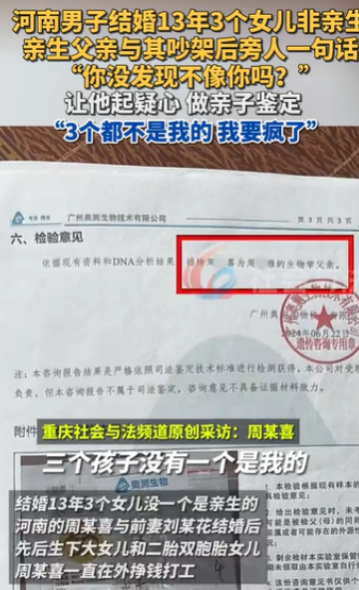 河南,男子和亲二伯大吵一架,同村就有人跟男子说:“你没有发现你的大女儿长得像你二伯吗?”说者无意,听者有心,男子把话记在心里了,转身就和3个女儿做了亲子鉴定,结果发现这三个女儿都不是自己亲生的,结婚13年了,他竟然替别人养了13年的孩子。 据重庆社会与法频道,8月22日报道,周先生外出打工回家,难得回来一趟,他的亲二伯竟然找茬,与他吵架了。 这一架吵得很厉害,两人的声音大到周围的邻居都听到了,周先生回来是想和妻女开开心心过几天的,结果他的好心情都被自己的亲二伯给毁了。 他和自己的亲二伯吵架之后,一个人闷闷不乐,就找邻居聊天,将他对自己亲二伯的不满,对着邻居们诉说。 结果有邻居看不下去了,就点醒了他:“难道你没发现,你的大女儿和你的亲二伯有点像吗?” 此话一出,大家都不说话了,空气寂静得可怕,周先生更是愣得说不出一句话,大家一看气氛尴尬,都纷纷散去,留下愣在原地的周先生。 村民的这一句话,让他想起了自己的三个女儿,是啊,这三个女儿,是真的越长越不像他了,难道这真如邻居所说那样,他的三个女儿是他的亲二伯的? 周先生心中也起了怀疑,因为结婚的这13年来,他常年在外打工,他和妻子是聚少离多的,妻子若是对他有了背叛之心,他也很难发现。 更何况这一次,亲二伯无缘无故和他吵架,也让他觉得不对劲,他决定一探究竟,于是带着三个女儿都做了亲子鉴定,结果发现三个女儿都不是他亲生的。 13年了,他和妻子结婚13年了,妻子为他生了三个女儿,一个大女儿和两个双胞胎女儿,竟然都不是他亲生的。 当他得知这个事实,那一刻他觉得自己疯了,他无法接受这个事实。 13年来,他真的是对妻子和女儿尽心尽力,虽然他是一个人外出打工,难以陪伴妻子和女儿,但这份愧疚,让在外打工的他,不敢轻易多花一分钱。 他省吃俭用,把挣回来的每一分钱都转给了妻子,让妻子好好照顾三个女儿,他非常理解,妻子一个人在家中带三个孩子是很不容易的。 可现在,他才知道三个女儿都不是他亲生的,这让他情何以堪。 13年了,他对三个女儿,也是付出了自己所有的父爱,不但承担起养育女儿的一切,一有时间他也是赶紧回来,陪伴自己的三个女儿,给她们买漂亮的衣服,买好玩的玩具,只为她们喊一声爸爸,他就心满意足了。 他从来没有想过妻子竟然会背叛自己,13年来,他无条件地信任妻子,觉得妻子是个安分守己的农村妇女,不会做出背叛他的事情。 现在结果出来了,他都不需要质问妻子,就已经知道了事实,他无需和妻子多说一句话,他们的感情就已经缘分尽了。 可三个孩子的亲生父亲是谁,难道真的是他的亲二伯?他要求亲二伯去做亲子鉴定,但是他的亲二伯拒绝和这三个孩子做亲子鉴定。 知道这个事实后,周先生感到非常心痛,被妻子背叛的痛,让他彻夜难眠,付出13年的父爱,却得知孩子不是他亲生的,这让他不知所措。 他怀疑这三个孩子就是他的亲二伯的,但是亲二伯拒绝做亲子鉴定,妻子也不愿意说,他也无可奈何。 但他无法和妻子走下去了,他选择了和妻子离婚,并且要求妻子赔偿抚养费15万,但妻子迟迟没有赔偿。 更让周先生难以接受的是,他和妻子离了婚之后,妻子并没有远走他乡或者回娘家,而是选择了和他的亲二伯生活在一起。 一切不言而喻,三个孩子的亲生父亲到底是谁,好像一切都有了答案。 周先生也无需追究,到底谁才是这三个孩子的亲生父亲了。 但是周先生心里气不过,他为了拿回那15万的抚养费,他一直在努力,终于在今年的8月,他的前妻终于答应赔偿15万抚养费了,但是每年只能给1万元。 那么如何看待周先生所遇到的这些事呢? 1、如果周先生的妻子背叛他的对象,是周先生的亲二伯,那他们的行为真的是有违公序良俗。 《民法典》第8条规定:民事主体从事民事活动,不得违反法律,不得违背公序良俗。 一个是亲二伯,一个是侄媳妇,因为侄子外出打工,亲二伯就要和侄媳妇交往,传出去实在是让家人抬不起头。 2、周先生抚养了三个女儿,结果都不是他亲生的,那么他的前妻的行为已经构成了欺诈抚养。 《民法典》第1165条规定:行为人因过错侵害他人民事权益造成损害的,应当承担侵权责任。 欺诈抚养,周先生是可以要求妻子赔偿抚养费的,因为这一切都是妻子的过错。 3、亲二伯和侄媳妇在一起交往,他们的行为不利于家风建设。 《民法典》第1043条规定:家庭应当树立优良家风,弘扬家庭美德,重视家庭文明建设。 如果周先生的妻子找的是外面的男子,对整个家族影响还不算是很大,但是周先生的妻子找的是亲二伯,这真的不利于家风建设。 那么你对周先生的遭遇有何看法呢