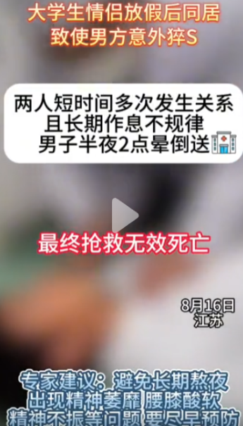 江苏镇江一对大学生放假同居,第18天凌晨2点,身高一米八二的男生小林突然倒下,医院抢了两个小时没救回来,新闻就这么炸出来了。 年轻人真不能仗着年轻就胡作非为!小林(化名)与小梦(化名)这两名大学生就是仗着自己年轻,长时间熬夜、多次同房导致小林抢救无效死亡! 根据8月21日的报道,暑假里,大学生小林和女友小梦,因为不想那么早回家,借着找实习工作的由头,瞒着双方父母,在市区合租了一间小公寓。 小林身高一米八二,是个爱运动、性格开朗的男生,在学校里很受同学欢迎;小梦则温柔细腻,两人恋爱长跑两年,感情一直很好。放假前,他们就商量着利用这个假期,一起找工作积累经验,也想多些二人世界。 同居生活一开始满是甜蜜。每天,两人一起去面试,挤公交时紧紧挨着;傍晚手牵手逛菜市场,回家研究菜谱,小梦打下手,小林掌勺,虽然偶尔把菜炒糊,却笑得格外开心。累了就窝在沙发上,分享彼此面试的趣事,晚上还会憧憬未来一起留在这座城市打拼的日子。 可随着日子推进,找工作的压力渐渐浮现。小林面试了好几家公司,要么觉得岗位不合适,要么没收到后续通知,心里越来越急躁。为了多投简历、准备面试,他常常熬夜改简历、查资料,作息彻底乱了套。 小梦劝他别这么拼,身体会扛不住,他却总说 “再试试,说不定就成了”,想着多努力些,能给两人未来更好的保障。 同居第 18 天,也就是 8 月中旬的一个凌晨 2 点,夜静得能听到窗外树叶的沙沙声。小梦起夜,发现小林直挺挺倒在床边,脸色惨白,叫他也没反应。她瞬间慌了神,颤抖着拨通急救电话。救护车呼啸而来,医护人员迅速把小林送往附近医院,全力抢救了两个小时,可最终还是没能留住他,宣告抢救无效。 医院给出的结论,和长期熬夜、生活不规律,出现精神萎靡腰膝酸软清神不振等问题,加上那段时间精神压力大脱不了干系。消息传到学校,传到双方父母那里,两个家庭陷入巨大悲痛。小梦更是陷入深深的自责与愧疚,不断问自己 “要是当时硬拉着他别熬夜,是不是就不会这样” 。 这件事在网上传开后,网友们议论纷纷。 有人说 “年轻人打拼也得顾着身体啊,别拿命换钱,命没了啥都没了!” 也有人感慨 “情侣同居得考虑清楚,压力和生活习惯的磨合,真不是小事。” 好好的青春,因为一场意外戛然而止,留下的是无尽的伤痛与遗憾。这事儿也给所有人提了个醒,不管是为了梦想拼搏,还是享受恋爱生活,都得把健康放第一位,别等失去才知道,没了健康,一切憧憬都成了泡影 。 生活里的压力、甜蜜背后,藏着的身体警报,真得早早重视,毕竟活着,才是一切可能的基础,别让年轻的热情,变成无法挽回的悲剧 。 对于这件事情,你们怎么看?