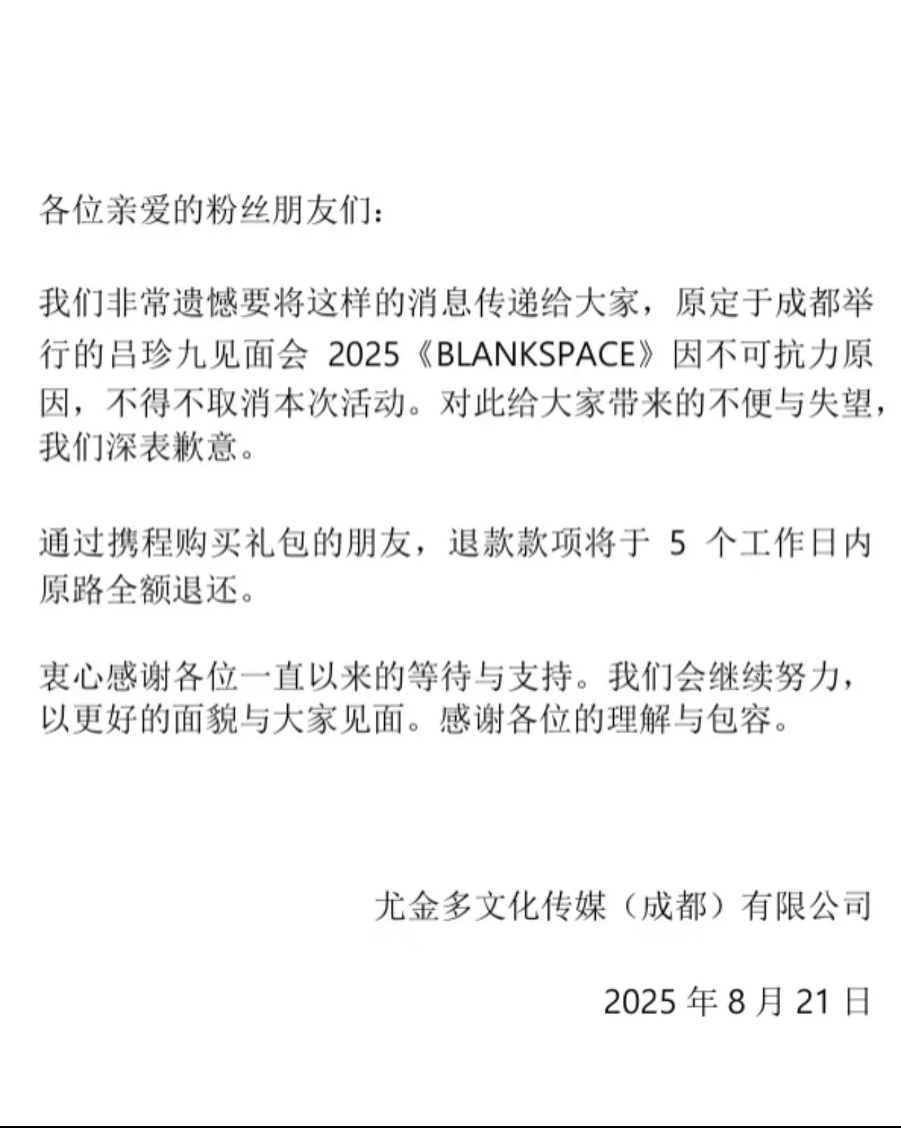 【成都】吕珍九成都见面会宣布取消 主办方宣布原定于09月20日在成都举行的吕珍九见面会2025《BLANKSPACE》因不可抗力取消。