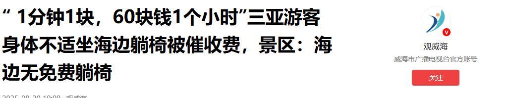 “活不起了?”一女子去三亚海边玩,见路边有沙滩椅,没想那么多就躺上休息。没想到刚坐下就被工作人员赶走,还说椅子60元每小时,不给钱就别乱坐。对此女子非常生气,海滩边一个休息设施都没有,破椅子还要钱,吃相太难看了。可工作人员却说:明码标价,不是乱收费! 一女子在三亚西岛游玩,可能是天气太热导致中暑,头晕无力,她看见不远处有沙滩椅,赶紧走过去想着稍作休息一下。谁知道这时,走过来一位工作人员,直接告诉她:这椅子是收费的,1分钟1块! 李女士(化名)趁着假期奔赴三亚,想好好感受海边风光。事发当天,她和朋友一起沿着海滩漫步,然后拍照记录这一美丽的风景,可能是天气热的缘故,李女士没一会就觉得被太阳晒的有点发晕,然后她想休息一下,但是周围都是海滩,没有椅子可以坐。 她和朋友继续往前走着,远远瞧见一排沙滩椅,想着坐会儿歇脚,缓一下再继续游玩,俩人来到沙滩椅所在的位置,看见有人在坐着,俩人没多想就躺了上去。刚闭上眼想缓口气,一位挂着工作牌的工作人员就走过来,手里拿着收款码。 她对李女士说,这些都是收费的,1个小时60块!李女士表示自己身体不适只是想简单休息一下,一会就走了,希望可以坐在这里。但是工作人员却态度强硬,催促着他们缴费,不然就走人! 李女士又惊又气,自己只是身体不适想短暂休息,没想占啥便宜,可对方态度强硬,仿佛她不交钱就是占便宜一样,这让她感觉格外委屈。李女士只好起身离开躺椅,可是她越想越气,自己明明购买了98元的门票,却找不到免费休息的座椅! 其实,这沙滩椅收费的事儿,在三亚海滩不算新鲜。景区工作人员早就习惯了这类解释:海边本就没免费躺椅,都是经营性质的。要是游客身体不舒服,景区有免费医务室能提供帮助,言下之意,别想着靠沙滩椅免费歇脚。 可在游客眼里,海滩这么大,连个临时应急休息的设施都没有,身体不舒服时想坐会儿椅子,还得被催费,实在膈应。而且据李女士观察,躺椅旁的提示牌上还显示“物品遗失,概不负责!” 这让李女士很不理解,自己缴费坐在这里休息的意义是什么?而且她觉得,景区缺乏足够的休息设施,而且这个免责牌十分不合适 视频在网上发布后,也被相关部门看到。市场监管局的回应,也给这事定了性:躺椅收费属于市场调节价,商家根据成本设置价格,只要明码标价,就合法合规!可合法合规,就代表合情合理吗? 这事传开后,网友们也炸开了锅。有人说:“景区太没人情味!游客身体不舒服,临时坐一下都不行?就差这几十块钱?明码标价是规矩,可服务温度也得有啊!真要游客晕过去,是 60 块钱能解决的?” 还有人说道:“人家收费,告知你了,你不想花钱走就是了。又没有强制消费,在外游玩,多一事不如少一事。” 对此你怎么看?欢迎大家在评论区留言讨论。 信源:大象新闻 发布于2025年8月21日