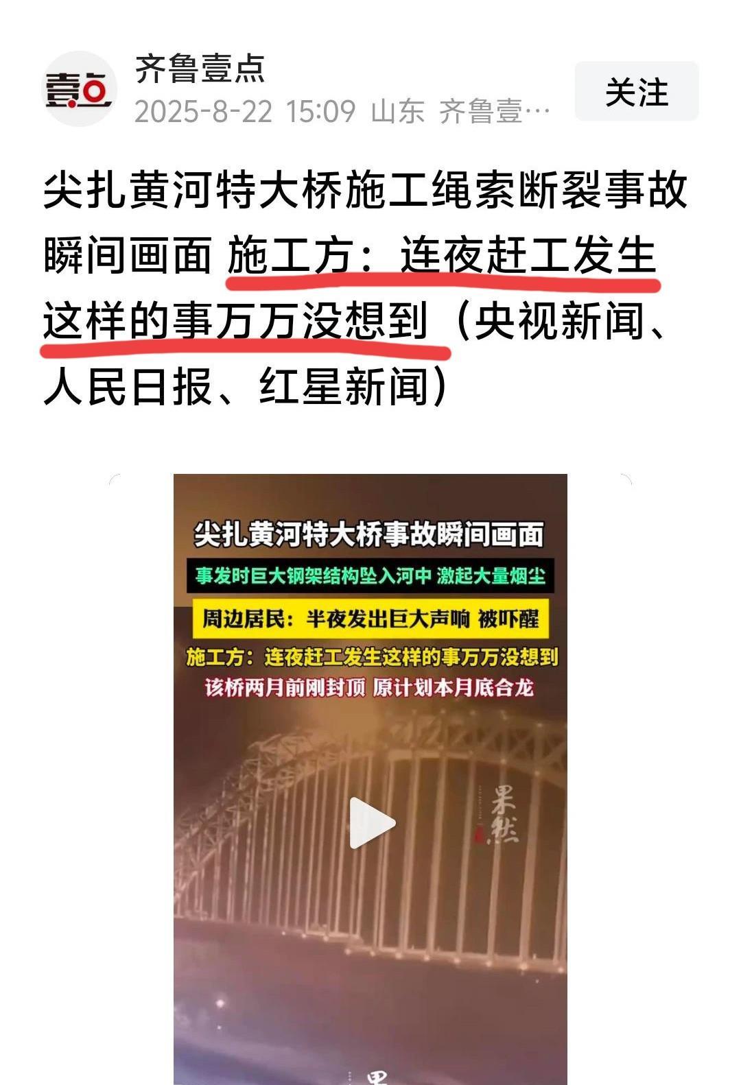 这次川青铁路大桥钢索断裂, 可能早有征兆,也许可以避免[发怒][发怒] 下面是可能的3个原因, 仅供参考,一切以官方报道为准 1、桥体合拢前,右边钢索少了一根, 通常来说,建桥左右各一半, 结构做法也是左右对称, 重量一样,钢索数量也应该一样; 2、桥梁在白天的时候, 右侧的悬索钢丝, 已经不是全员绷直状态,松松垮垮, 说白了,只有部分钢索在超负荷工作, 等到这些钢索断裂的时候, 就发生了多米诺效应,突然彻底垮塌, 3、夜间赶工, 本来白天就存在的安全隐患, 到了晚上更难察觉, 特别是到了半夜,人员是最疲惫的时候, 放松警惕,不出事才奇怪[流泪][流泪] 有新闻报道说,这次川青铁路大桥, 2月前封顶,原计划本月合拢, 连夜赶工发生这样的事,万万没想到, 说白了,还是疏忽了, 没有做到警钟长鸣,安全第一, 桥是给人走的,不是让人死的, 但愿类似悲剧不要再发生[谢谢][谢谢][谢谢] #尖扎黄河特大桥事故已致12人死亡# #万能生活指南# #尖扎黄河特大桥事故前后对比画面曝光#