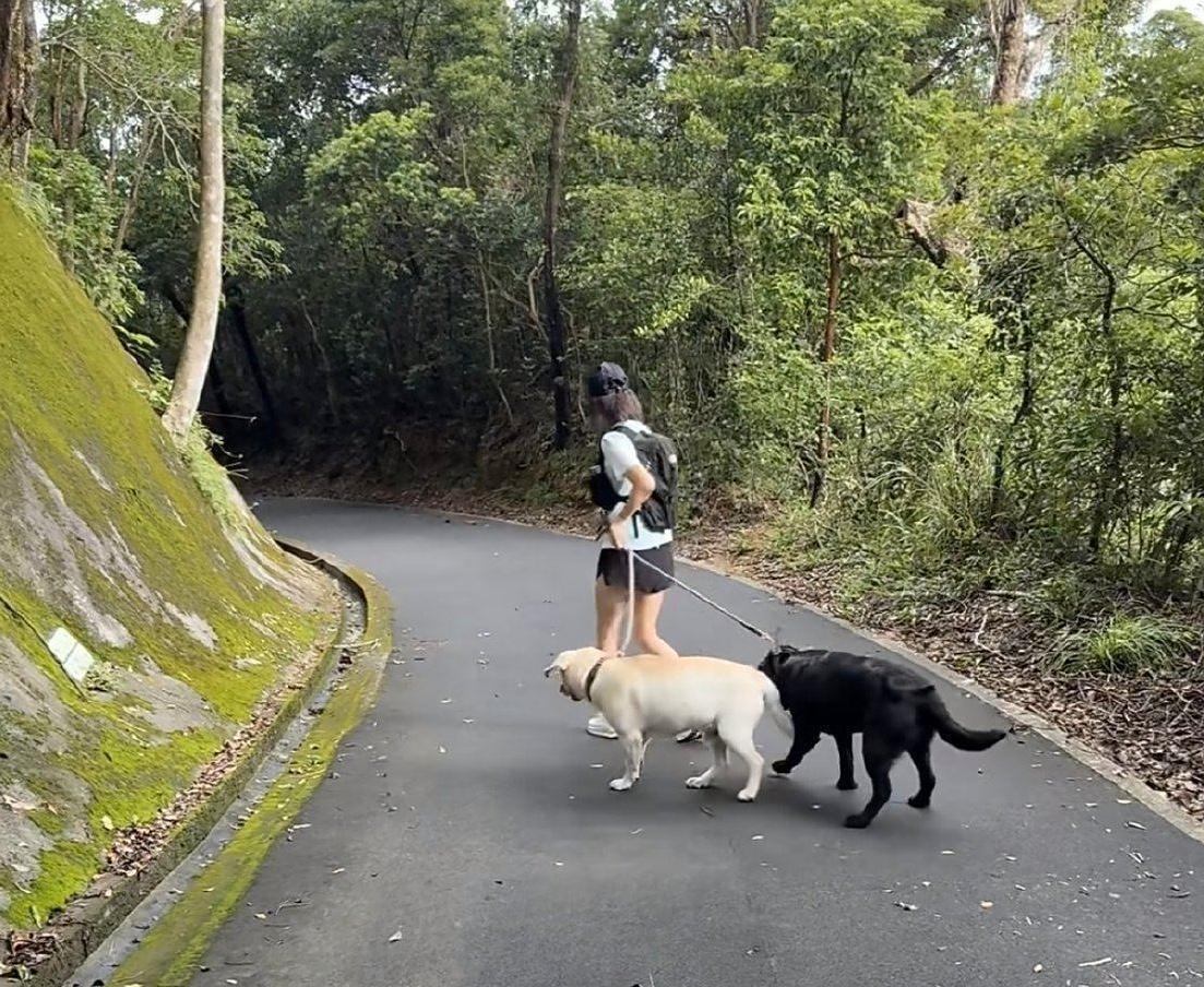 刘嘉玲在香港爬山,一个人牵着两条大狗,没有给狗带嘴套,看起来好危险,出事了就惨了!
