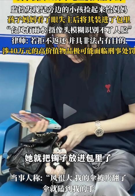 “太难了”,珠海,一男孩捡到一条漂亮的手镯,上面全是钻石,开心的给了妈妈。没曾想妈妈一个动作,引发争议,她居然选择了把手镯放在自己包里就离开了。 “喂,我要报警,我价值40万元的手镯丢了!” 失主一开始发现手镯不见时,心里十分着急,焦虑感迅速蔓延全身。 这枚手镯是一款卡地亚经典款,黑色陶瓷与白金的搭配显得低调而奢华,而镶嵌的钻石在光线下闪闪发亮,闪烁出独特的光芒。 更重要的是,她的价值接近四十万元人民币。 对于普通家庭来说,这是一笔几乎可以改变生活品质的大额支出。 更让她心痛的是,这不仅仅是一件贵重饰品,对失主来说意义非凡。 时间回到8月14日,珠海某商场附近,本来平静的午后忽然下起了雨。 街上的行人纷纷加快步伐,失主正站在商场门口,焦急地等待来接她的车。 手里的雨伞在狂风中几乎就要被刮飞,她拼命稳住伞柄,却仍被一阵强风吹得失去平衡。 就在那一刻,伞骨狠狠磕到了她的手腕,随着一声清脆的“当啷”,失主心里猛地“咯噔”一下,低头一看,那枚价值四十万的“满天星”手镯竟不翼而飞了。 这手镯材质特殊,平时在灯光下闪烁着独特的光芒。 雨水打湿了她的头发和衣角,也模糊了视线。 但她根本顾不上,她弯下腰仔仔细细在地面上寻找遗失的手镯。 眼看寻找无果,她只能忍住泪水,拿出手机拨打报警电话,希望警方能够帮忙,也期盼那个捡到手镯的人能还给自己。 事发当天狂风暴雨,雨水打在摄像头上,画面变得非常模糊,根本无法清晰识别出任何人的面部特征。 尽管如此,监控还是捕捉到了关键的瞬间。 一个大约五六岁的小男孩蹲在地上,眼睛亮晶晶地盯着雨水冲刷出的水洼旁闪着光的小东西。 他弯下腰,小心翼翼地捡起一条亮闪闪的手镯。 小男孩兴奋地跑回妈妈身边,手里举着那条手镯,眼里闪着期待的光。 他小心翼翼地把手镯递给妈妈,声音带着几分天真,“妈妈,看看我捡到了什么!” 妈妈接过手镯,只是淡淡瞥了一眼,眉头微微一皱,但没有多说什么。 她把手镯塞进自己随身的包里,然后迅速转身,带着孩子离开了。 这件事情在网上引起了热议。 有人抱持善意,觉得妈妈可能根本不认识卡地亚这个品牌,以为这只是孩子捡到的一个好看的玩具,或者几十块钱的地摊仿制品,完全没有意识到它的真正价值。 她把手镯放进包里,或许只是怕孩子拿着玩弄丢了,纯属无心之失。 可也有另一种更严厉的说法认为,妈妈接过手镯后那个仔细查看和环顾四周的动作,并非偶然。 这几秒钟的犹豫,分明是她内心良知与贪念激烈对抗的表现,最终,贪念可能占了上风,导致她做出了这样的选择。 不管妈妈真实想法如何,她“顺手放包”的举动已经让母子俩成了大家关注的焦点。 律师们普遍提醒,如果捡到贵重遗失物却“拒不交还”,就可能触犯“侵占罪”,情节严重的,最高可能面临五年有期徒刑。 不过,法律上认定侵占罪,最关键的四个字就是“拒不交还”。 其实,生活中丢失贵重物品的事并不少见,特别是在人流多的地方或天气不好的时候,这类意外更容易发生。 当意外之财突然降临,你会做出什么选择呢?