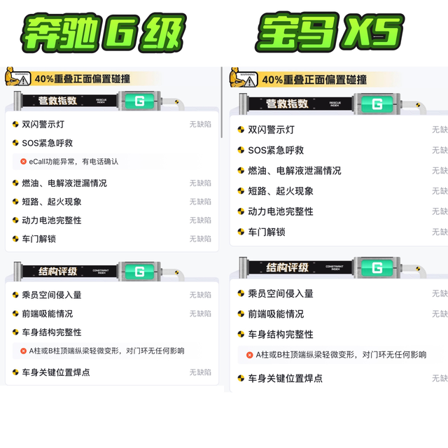 1. 车身结构表现: • 宝马 X5:车身结构方面整体表现良好,在碰撞测试中能够较好地保持乘员舱的完整性,为车内乘员提供了一定的生存空间。这显示出其在车身用料和结构设计上有较高的水准,能够有效地分散和吸收碰撞能量。不过,国产宝马 X5全系没有膝部气囊,这可能在某些特定情况下会对前排乘员的腿部保护产生一定影响,而美国版本则全系标配膝部气囊,这一点可能会引发消费者对其减配行为的关注。 • 奔驰 G 级:作为一款硬派越野车,其车身结构的坚固性一直是其重要特点。在碰撞测试中,车身结构也表现出了较高的强度,能够抵御较大的冲击力。但在一些测试项目中,也暴露出了部分问题,例如在某些碰撞角度下,A 柱上方出现了一定程度的变形,这可能会对车内乘员的安全造成威胁。 2. 对乘员的保护效果: • 宝马 X5:在碰撞发生时,车内的安全气囊、安全带等约束系统能够及时发挥作用,对乘员的身体部位进行了一定的保护。然而,测试结果显示前排女性假人小腿受伤严重,这可能与车内的空间布局、踏板位置或者约束系统的配合等因素有关,需要进一步分析和改进。 • 奔驰 G 级:碰撞后,后排两个成年男性假人的胸部受到了伤害,超过了可接受的范围,在真实车祸场景下可能导致肋骨骨折。这表明奔驰 G 级在对后排乘员的保护方面还有所欠缺,可能是座椅的设计、安全带的位置或者约束系统的力度等方面存在不足。 3. 安全配置的差异: • 宝马 X5:配备了较为全面的主动安全和被动安全配置,如车身稳定系统、胎压监测、并线辅助、车道偏离预警系统、车道保持系统、主动刹车/主动安全系统等。这些配置在日常驾驶中能够有效地预防事故的发生,在碰撞发生时也能够为乘员提供额外的保护。 • 奔驰 G 级:同样具备一系列的安全配置,但在此次测试中,其安全配置的效果并没有完全发挥出来。尤其是在对后排乘员的保护方面,安全配置的不足或者未能有效发挥作用,导致了后排假人胸部受伤严重的情况。 4. 价格与安全性能的匹配度: • 宝马 X5:价格在 49.50 - 70.96 万之间,作为一款豪华中大型 SUV,其安全性能在同级别车型中处于较高水平,但在此次碰撞测试中也暴露出了一些问题,尤其是在对前排乘员小腿的保护方面。因此,从价格与安全性能的匹配度来看,宝马 X5 还有一定的提升空间。 • 奔驰 G 级:价格在 131.98 - 243.12 万之间,是一款价格较高的超豪华车型。然而,在碰撞测试中,其对后排乘员的保护性能不佳,与它的高价形成了一定的反差。这也提醒消费者,高价并不一定意味着绝对的高安全性。 总体而言,宝马 X5 和奔驰 G 级在懂车帝的碰撞测试中都有各自的优势和不足。宝马 X5 在车身结构和主动安全配置方面表现较好,但在某些细节上还需要进一步优化;奔驰 G 级的车身结构坚固,但在对后排乘员的保护方面存在明显的短板。消费者在选择这两款车型时,需要综合考虑自己的需求和对安全性能的重视程度。