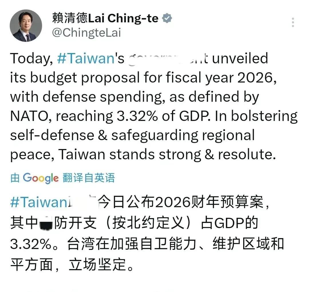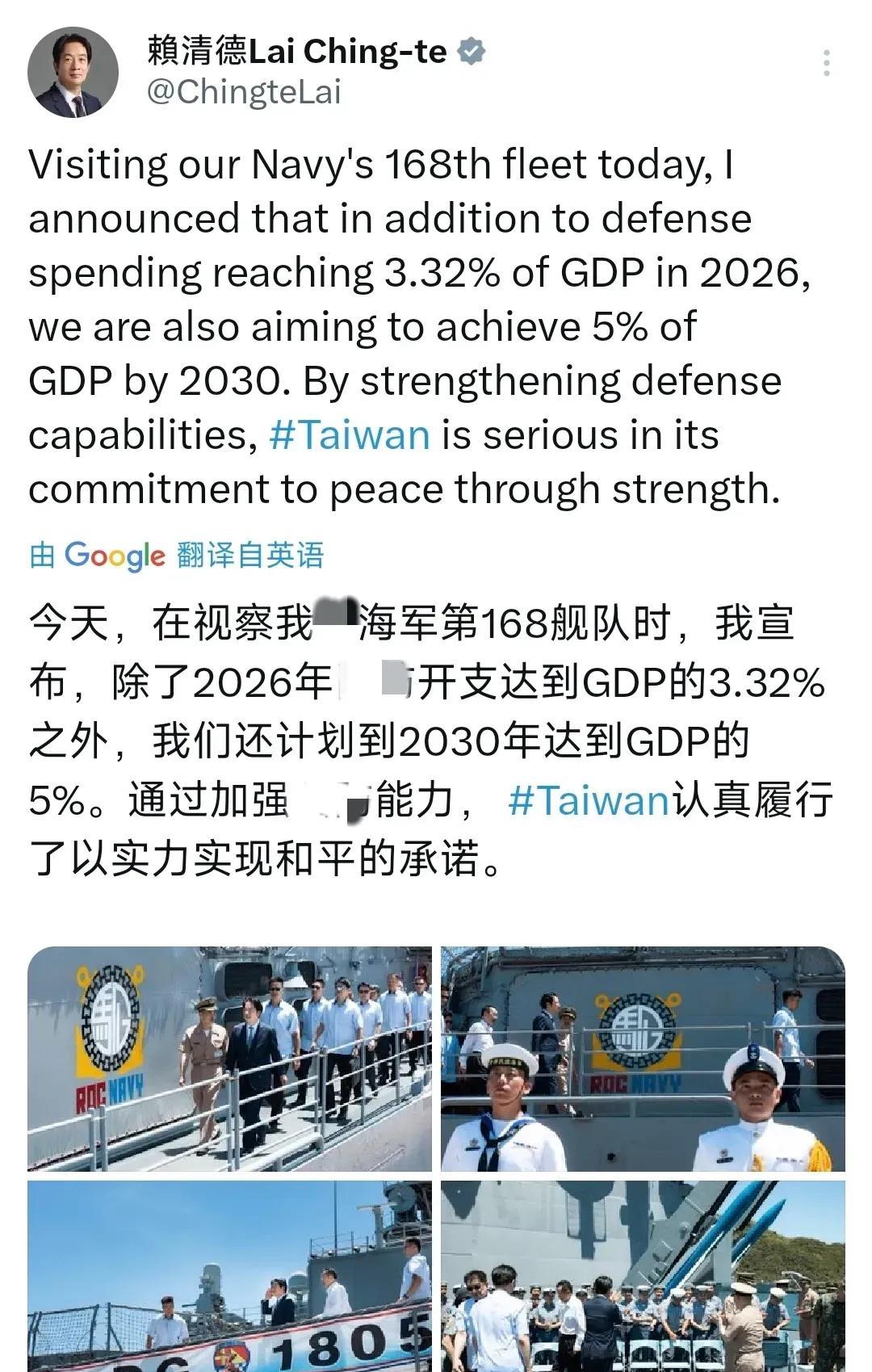 赖清德8月22日晚写道:“今天,在视察海军第168舰队时,我宣布,除了2006年防务开支达到岛内生产总值的3.32%之外,我们还计划到2030年达到5%。通过加强防务能力,台湾认真履行以实力实现和平的承诺。” 台湾地区今年的防务开支为198.31亿美元,明年3.32%的防务预算达到236.31亿美元,要达到主子要求的5%,要比今年的防务预算翻倍而达到396.62亿美元。 台湾地区一边享受着大陆的惠台政策,台当局却一边搞穷兵黩武,另一边还笑纳了美国20%的关税(加上12%的汇率损失,实际达到32%)。据海关总署公布的数据,上年度台湾地区对大陆的贸易顺差为1425亿美元,今年1~7月顺差为700.53亿美元。但是民进党当局仅凭几百亿美元防务预算就想“以武谋独”,实在异想天开,也无异于自取灭亡。