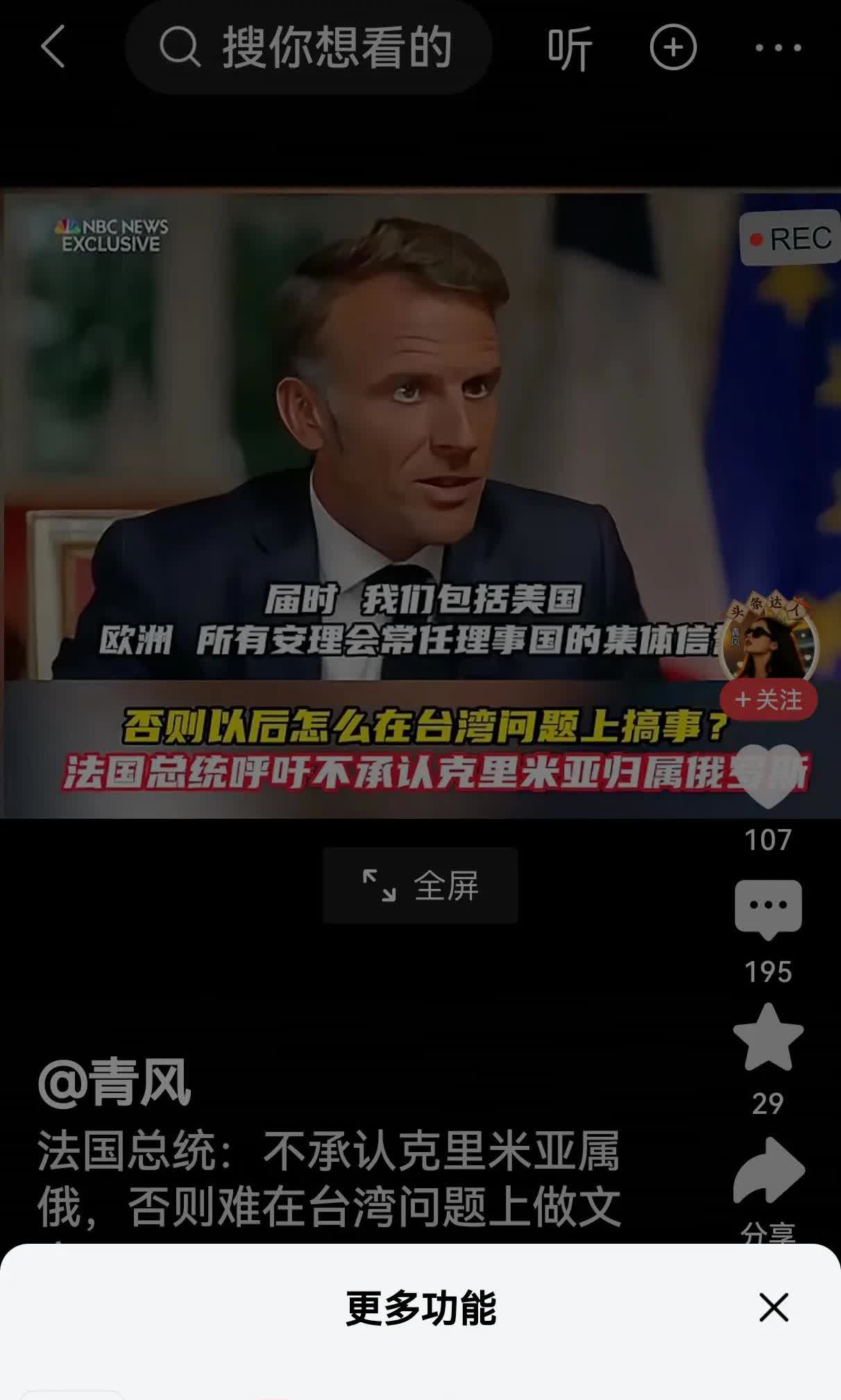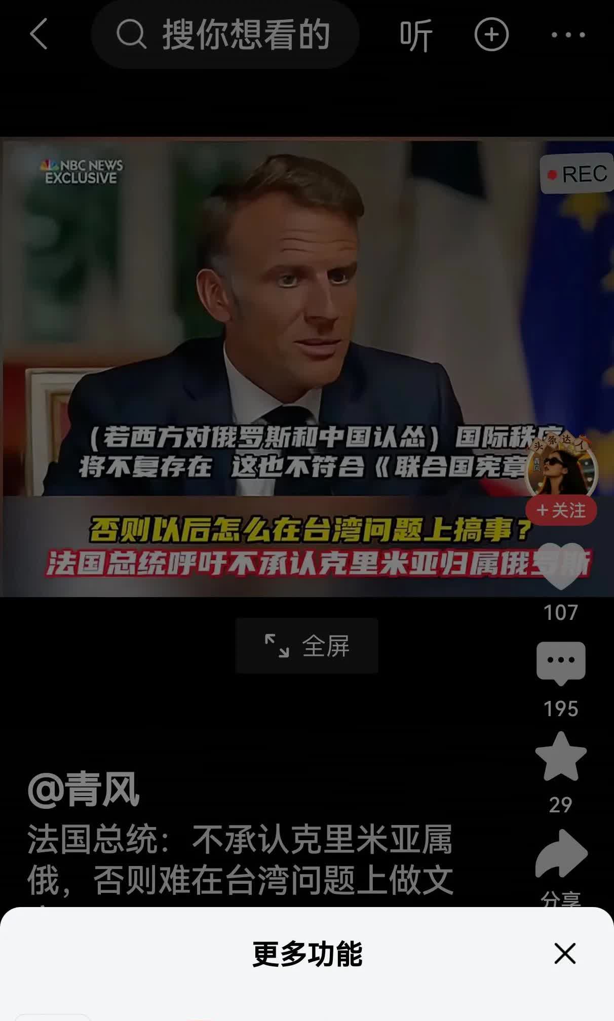 法国总统马克龙妄言:“不能承认克里米亚属于俄罗斯,否则以后怎么在台湾问题上搞事!” 马克龙这是叫特朗普训懵了,还是叫他老婆揍晕了,怎么连点基本常识都不懂? 克里米亚是什么?台湾又是什么?这是一回事吗?还五大常任理事国的总统呢? 马克龙你以为你法国是个什正义正派人权国家吗?八国联军侵入北京没你的份?火烧圆明园没你的份?抢中国宝物没你的份? 台湾是中国的一个省你不知道?解决台湾问题是中国的内政你不知道?中法建交的政治基础是承认“一个中国”原则、承认台湾是中国的领土你不知道? 连点国家自主权都没有的法国也配是常任理事国? 侵略中国的法国也配干涉中国的内政? 就当法克龙说了屁话臭臭而已,连自己的家里事都搞不明白的主还有闲功夫管别人家的事!真是吃饱了撑的!