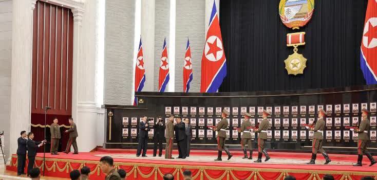 金正恩,拥抱参与俄对乌作战朝鲜军人。 朝中社今天(22日)披露消息称,朝鲜领导人金正恩在朝鲜劳动党总部举行的仪式上向协助俄罗斯对抗乌克兰的士兵致敬,授予他们“国家英雄”称号(图4)。为了悼念在战斗中牺牲的士兵,金正恩在纪念墙前献花并默哀(图3)。金正恩还慰问了阵亡士兵的家属,但没有说明仪式在平壤何时举行。 现场纪念仪式上,悬挂着约100名朝鲜阵亡军人的遗像(图2)。 据朝中社报道,当天还举行了文艺表演和宴会,以表彰这些参与俄罗斯对乌克兰战斗的朝鲜士兵,遇难者家属也参加了此次活动。现场画面显示,金正恩还在文艺演出中拥抱了参与这场海外作战部队的朝鲜军人(图1)。 根据金正恩和俄罗斯总统普京于2024年6月签署的双边防御合作条约,朝鲜自去年10月以来一直向俄罗斯派遣数千名士兵,以支持其对乌克兰的战争。该条约规定,如果任何一国受到攻击,朝鲜将向俄罗斯提供相互援助。