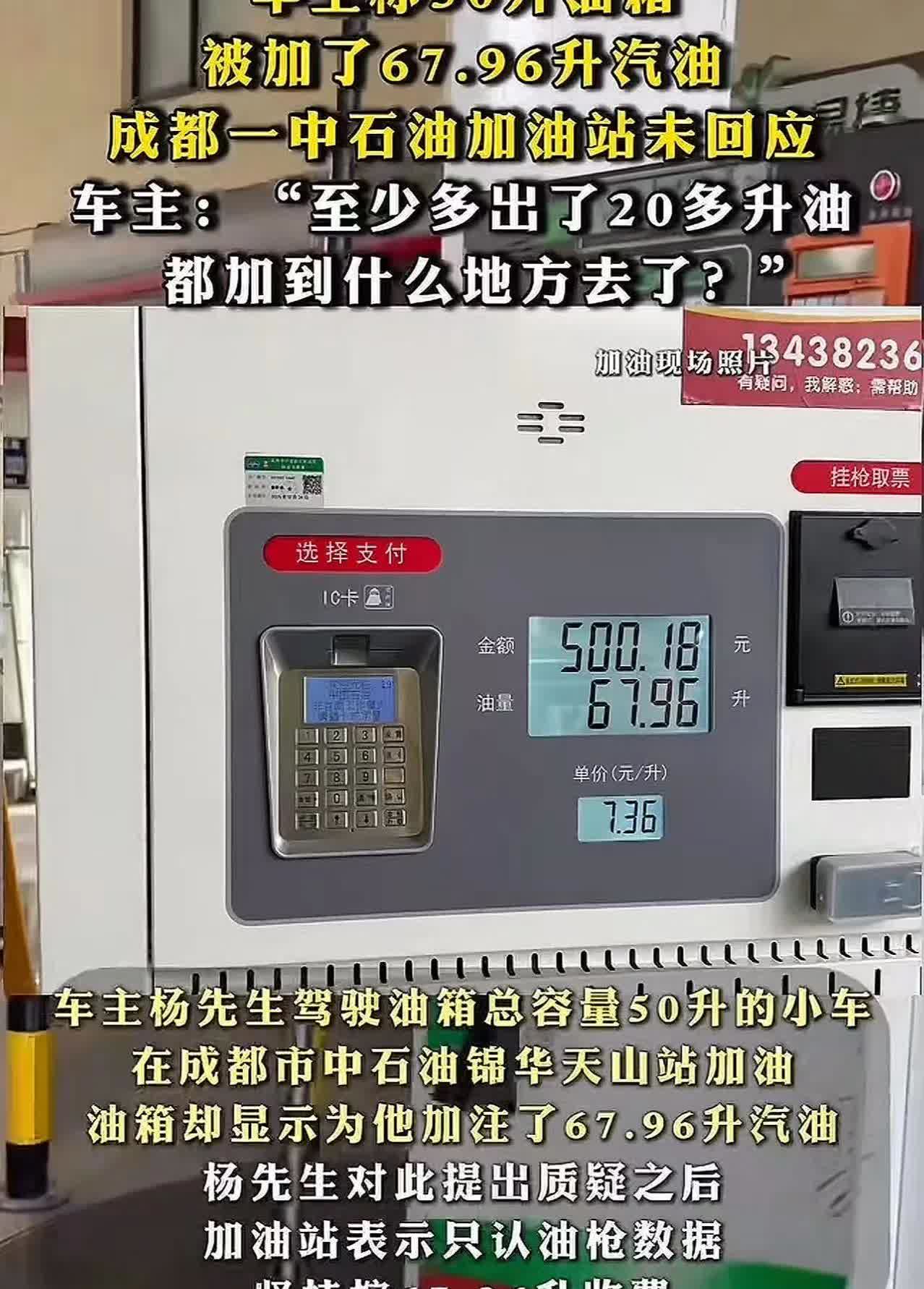“20多升油到底加到哪儿了?”男子的车油箱设计最大容量就只有50L,却被加油站加