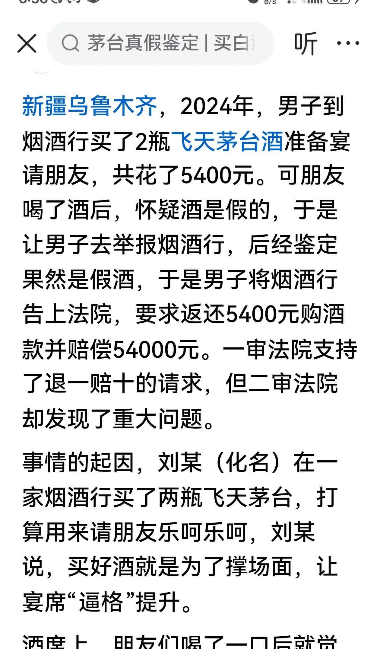 新疆乌鲁木齐一男子购买2瓶53度飞天茅台,花费5400元。经鉴定为假酒。遂提出诉
