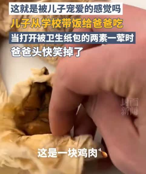 浙江,因为男子一直问儿子在学校里吃什么饭,直到那天儿子放学回到家后,竟从口袋里拿出来了几坨卫生纸,男子看后也是懵了,问儿子这些是什么东西,儿子见状满脸宠溺的说到,这是给爸爸从学校带的饭,想让爸爸尝尝好不好吃。 在浙江的一个普通人家里,有位老爸天天都会问儿子,在学校都吃了啥好吃的。就这么平平常常的父爱,却在有一天放学后,得到了一个让人惊讶的回答。 那天,孩子放学回家,老爸还是笑着问:“今天学校伙食咋样啊?”孩子没急着说话,而是从兜里掏出几团被卫生纸包得严严实实的小东西,递给老爸。老爸一看,愣住了,瞅着这些皱皱巴巴的纸包,纳闷地问:“这是啥玩意儿?”孩子却笑着,一脸认真地说:“这是给你留的饭,想让你尝尝味道咋样。” 老爸心里猛地一暖,小心翼翼地一层层剥开卫生纸,里面竟是几口饭菜,米饭、鸡肉、小番茄还有海带结,两素一荤,搭配得还挺讲究。他瞅着这些被孩子宝贝似的藏在兜里带回来的饭菜,一下子明白了——原来自己每天的念叨,孩子都放在了心上,他以为老爸真的馋了,就偷偷打包带回来了。爸爸笑着,一口一口慢慢把饭吃光了,眼睛里全是感动。孩子的心意,比啥好吃的都让人心里暖和。从那以后,爸爸专门给孩子准备了一个小巧干净的盒子,下次孩子就能方便地给自己“带饭”了。就这样,父子俩的这份亲情,在一顿饭里,悄悄地传递着。