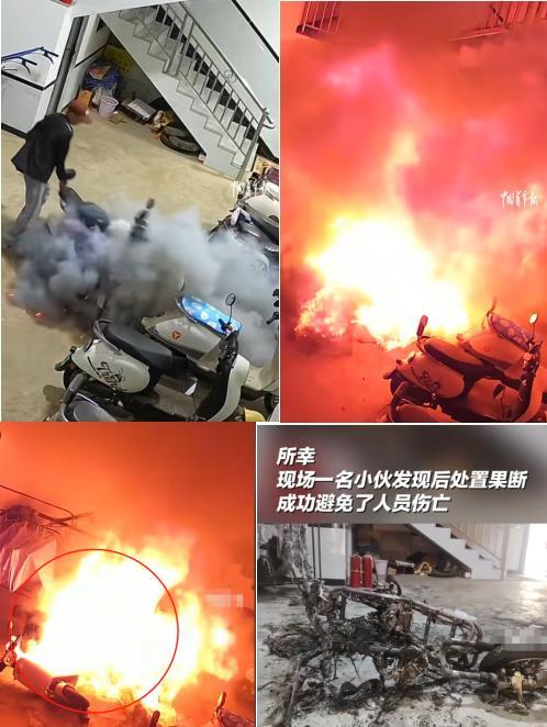 太吓人了!云南,一出租房内一排电动车,一辆正在充电的车突然冒烟,旁边小伙第一时间将车辆拽出来,刚拽到空地突然爆炸燃烧,屋内火光冲天,黑烟弥漫! 近日,云南泸西的某出租房内,一个小伙刚把电动车放好,旁边是一排电动车,他刚转身就发现一辆正在充电的电动车冒出了黑烟,吓了小伙一跳! 但本能告诉小伙一定要把车隔离开,否则一旦引发所有车辆燃烧,将会造成重大火灾,后果不堪设想。 他毫不犹豫的三步并两步跳到冒烟车尾处,用力地将车向外拉,拉车的时候车辆已经开始着火! 仅仅三四秒钟,小伙将着火的车辆拉到旁边空地,还没等小伙进一步动作,电动车猛地发生爆炸,火光冲天,满屋子都是黑烟! 幸亏小伙的动作及时,否则这一辆车爆炸,旁边车挨的还近,都会被牵连爆炸,引发火灾! 小伙果断将起火电动车从密集停放的车辆中拉出,成功地避免了事故的扩大及人员的伤亡! 有网友评论: “还好他拉出来,这火灭火器都搞不定!” “车炸的时候,他还在拖车子,真的没事吗?” “太勇敢了,他的这一举动避免了更大的损失,为他点赞!” 火灾发生后,消防救援大队迅速抵达现场,对现场进行了细致检查,确认没有其他安全隐患后,才着手事故调查。 根据消防人员介绍,电动自行车一旦短路起火,30 秒就会燃烧并产生一氧化碳等有毒气体,100 秒内的火场最高温度可达 1200 摄氏度,冒出大量的黑烟遮挡逃生视线。 虽然此次未造成人员伤亡,但那辆被烧成残架的电动车,无疑是一记震耳欲聋的安全警钟。它提醒我们每一个人:电动自行车充电安全。绝不能掉以轻心! 只有时刻注意安全操作,才能最大限度地避免事故,保护自己和他人的生命安全! @中国青年报·惊心动魄!电动车充电过程中突发爆燃,小伙紧急处置未造成人员伤亡。