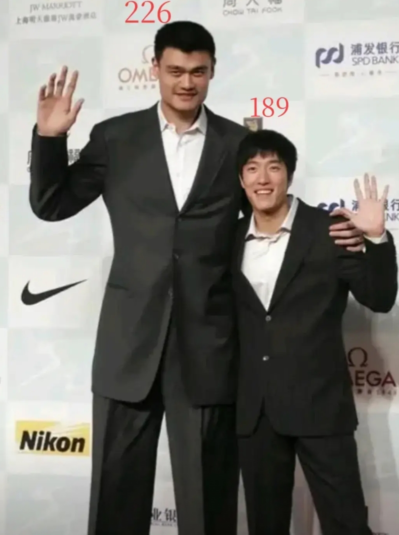 已知姚明官方身高226!年轻时候的他和189的刘翔合影时,刘翔刚好到达他的肩膀位置。可见姚明的肩膀就是衡量其他人是否过190的标准关卡。