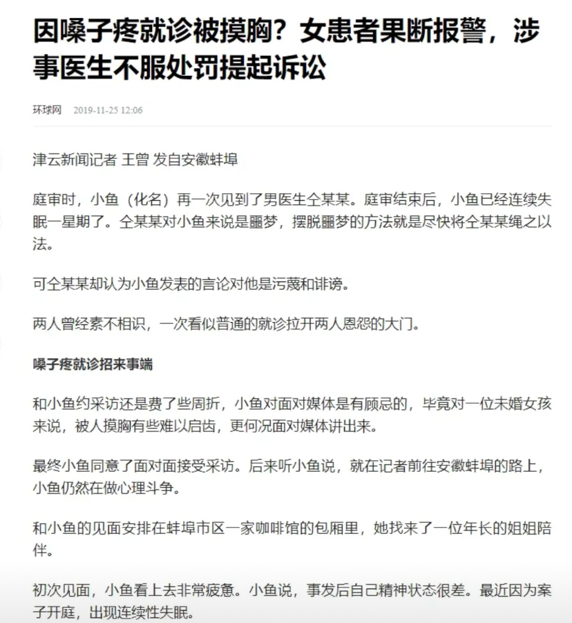 安徽蚌埠,一女子因喉咙痛去医院耳鼻喉科就诊时,男医生在未有护士在场、未提前告知并