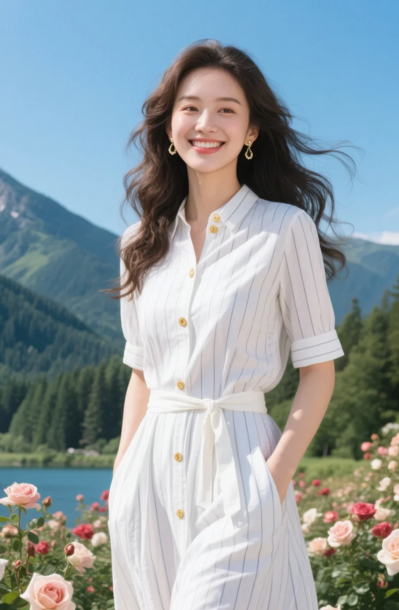 白裙拂过玫瑰,她在风里写下一首夏日诗行