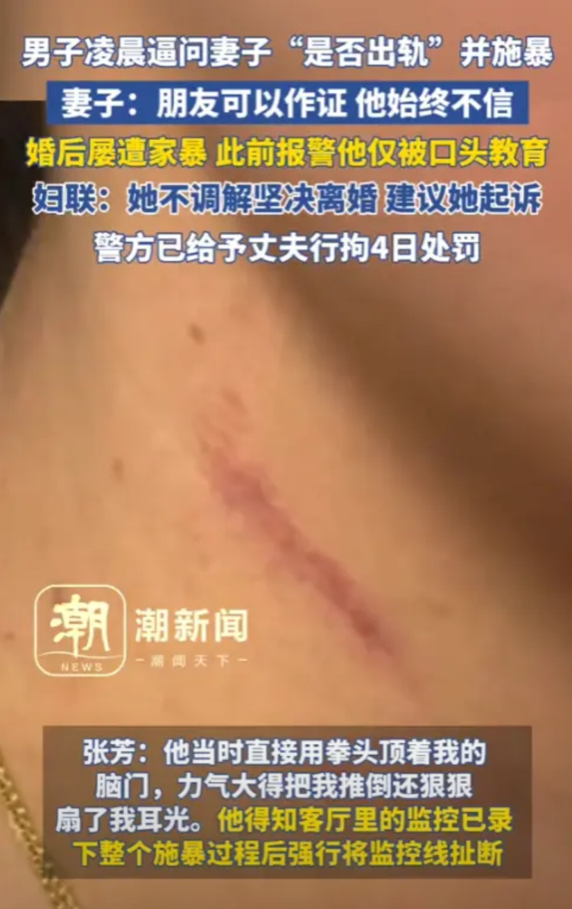 当天凌晨,天还黑着呢,女子跟朋友聚餐完刚到家,就被喝了酒的丈夫堵在了客厅,男的红着眼睛,指着她问是不是在外头有人了,女子赶紧说没有,可这话根本劝不住已经上头的丈夫。
