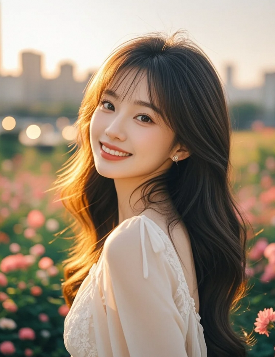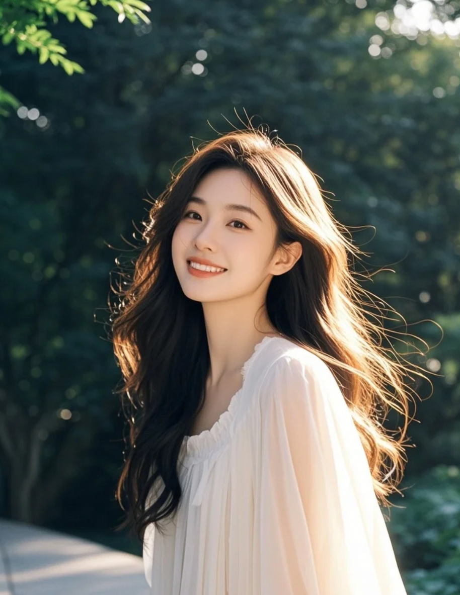 长发飘逸,笑容纯净,她站在光影里,如梦似幻