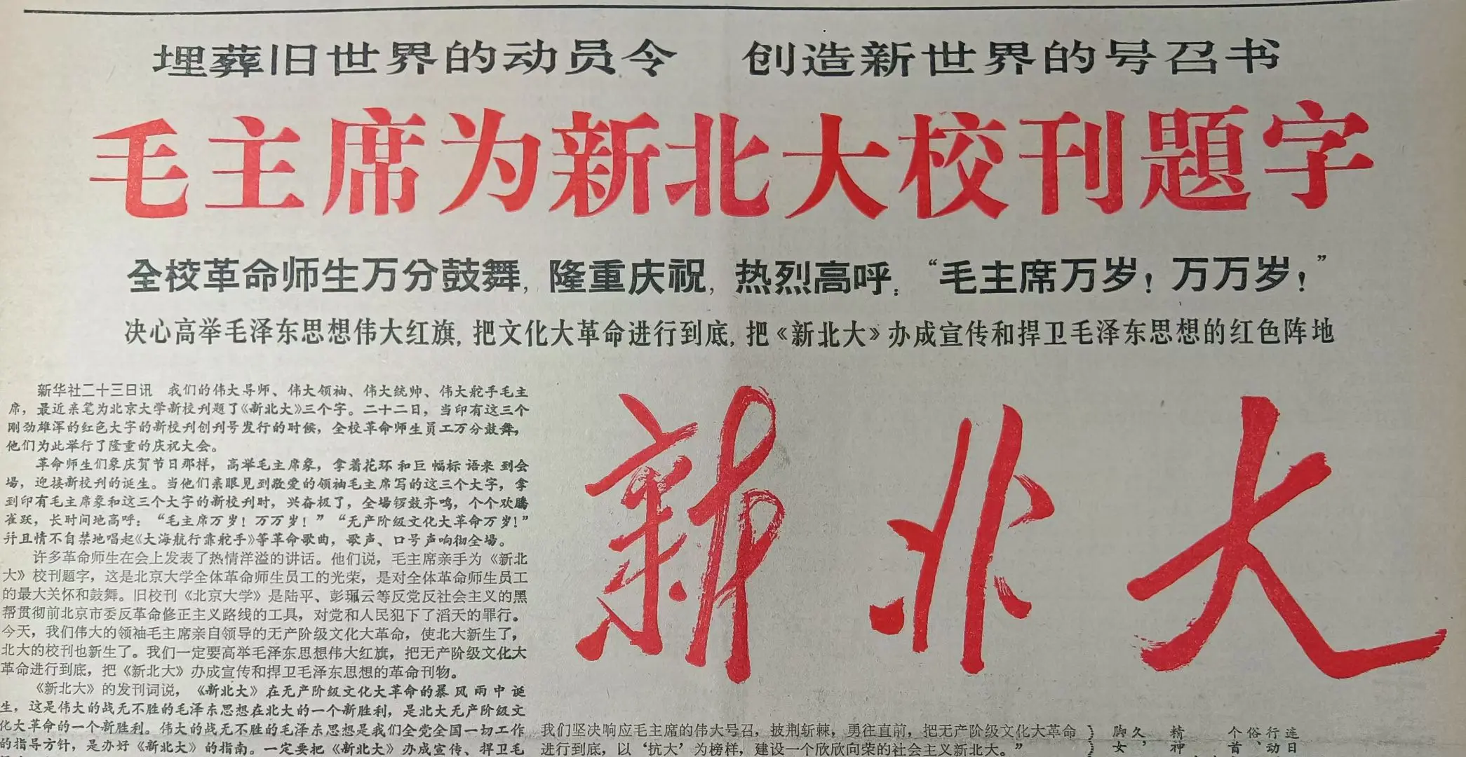老报上的今天---五十九年前的1966年8月24日《北京日报》头版头条套红报道:毛主席为新北大校刊题字:“新北大”。