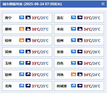 #广西天气#【受台风“剑鱼” 影响 广西部分地方有风雨影响】 今天白天到晚上,防城港、钦州、北海、崇左等市有小到中雨、局地大雨或暴雨并伴有短时雷暴大风等强对流天气,其它地区多云有分散阵雨或雷雨、局地大雨。 25日,桂南、桂西有中到大雨、局地暴雨或大暴雨并伴有短时雷暴大风等强对流天气,其它地区多云有分散阵雨或雷雨、局地大雨。24-25日,沿海地区有5~6级、阵风7级偏东风。 26日,桂西有中雨、局地大雨或暴雨并伴有短时雷暴大风等强对流天气,其它地区多云有分散阵雨或雷雨、局地大雨。 南宁市:今天白天到晚上,多云有阵雨或雷雨,偏东风2~3级,最高气温33℃,最低气温25℃。(广西气象台24日05时发布预报)