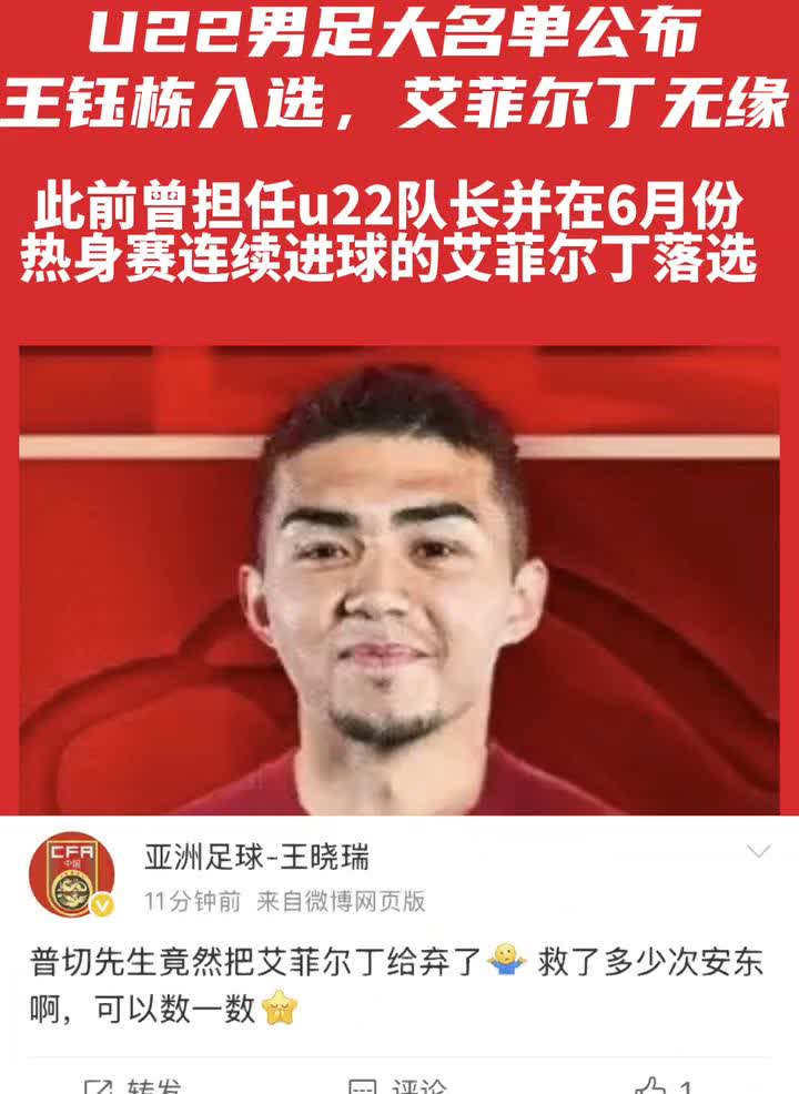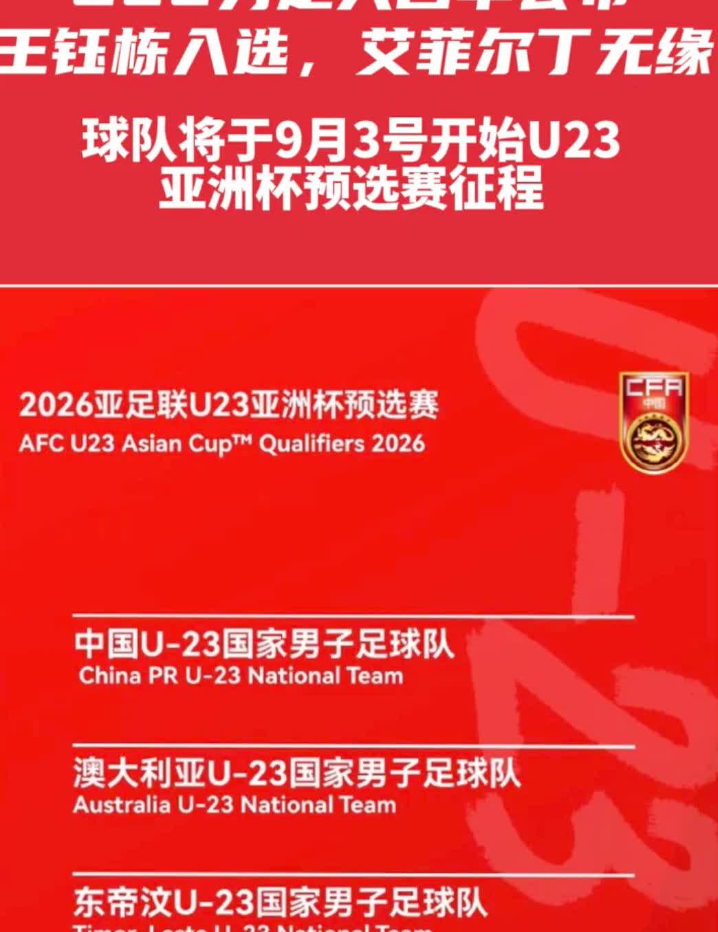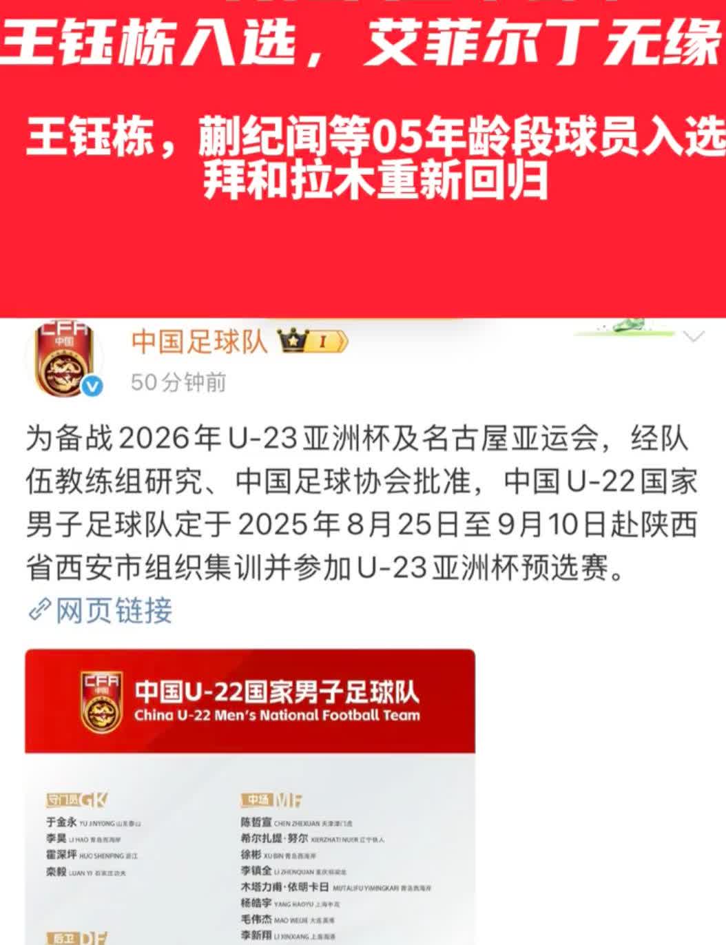 U22男足大名单公布,王钰栋入选,艾菲尔丁无缘。 王钰栋、蒯纪闻等05年龄段球