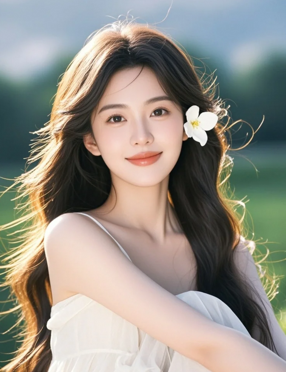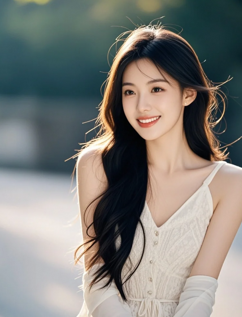 阳光下的长发精灵,笑容纯净,姿态优雅,充满诗意