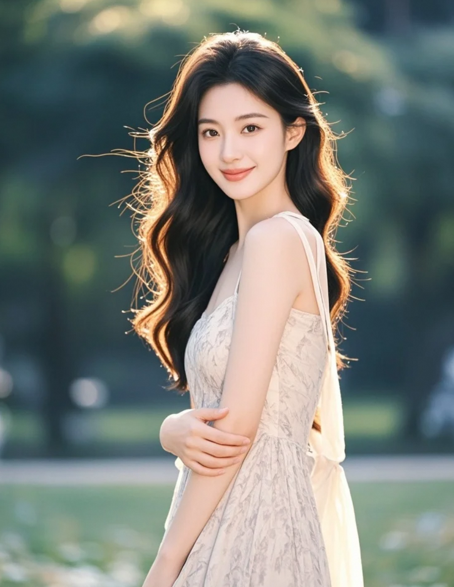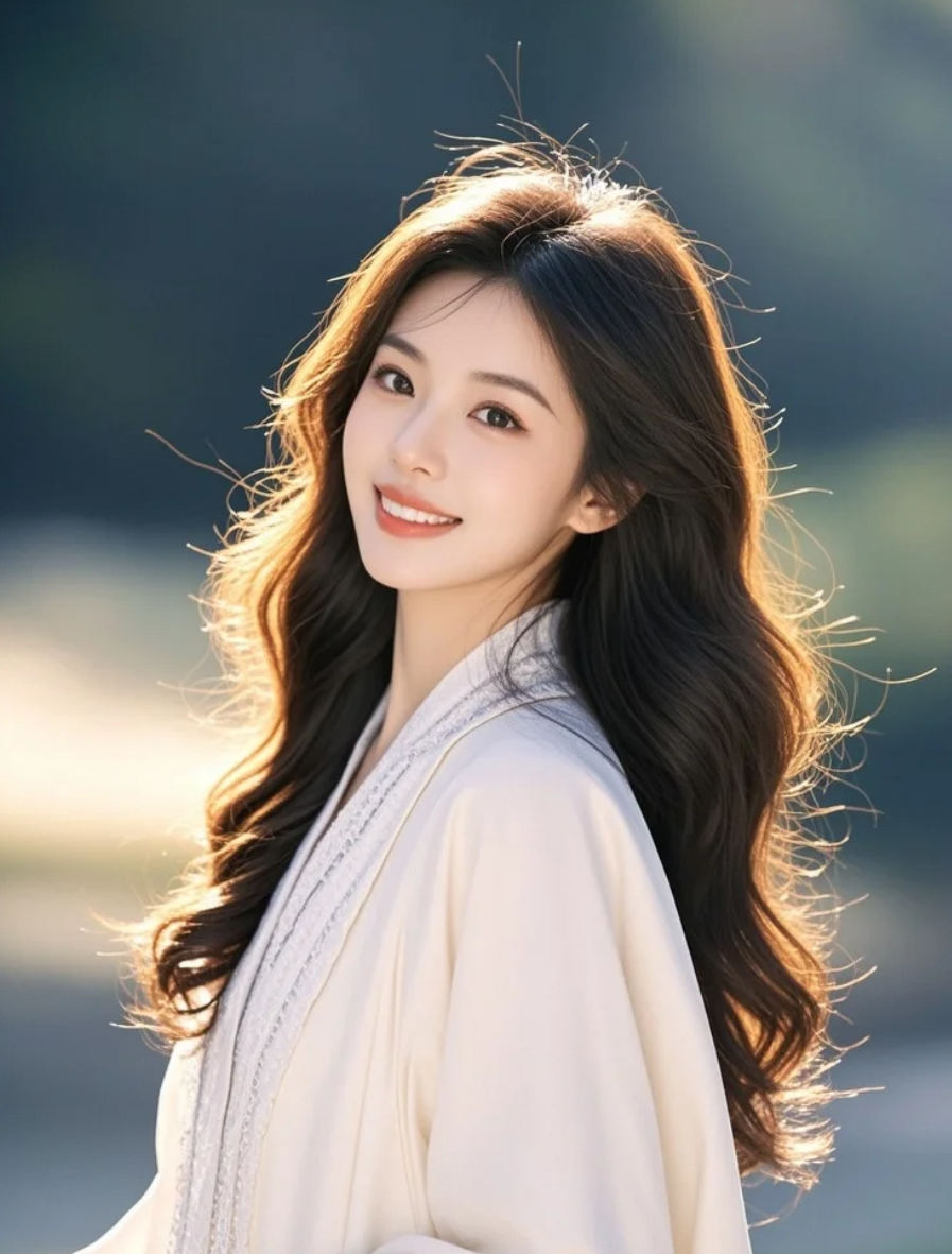 晚风拂过她的长发,温柔笑容在光影中显得格外动人