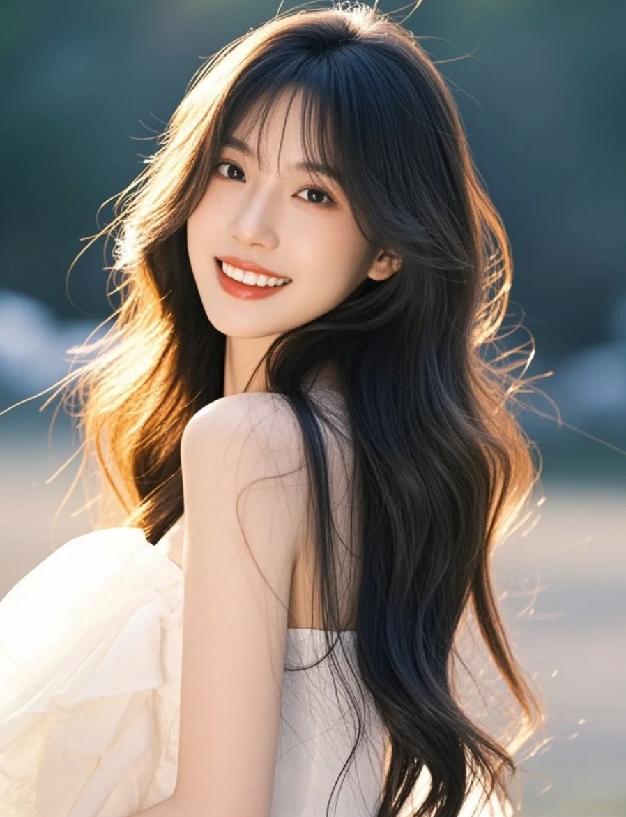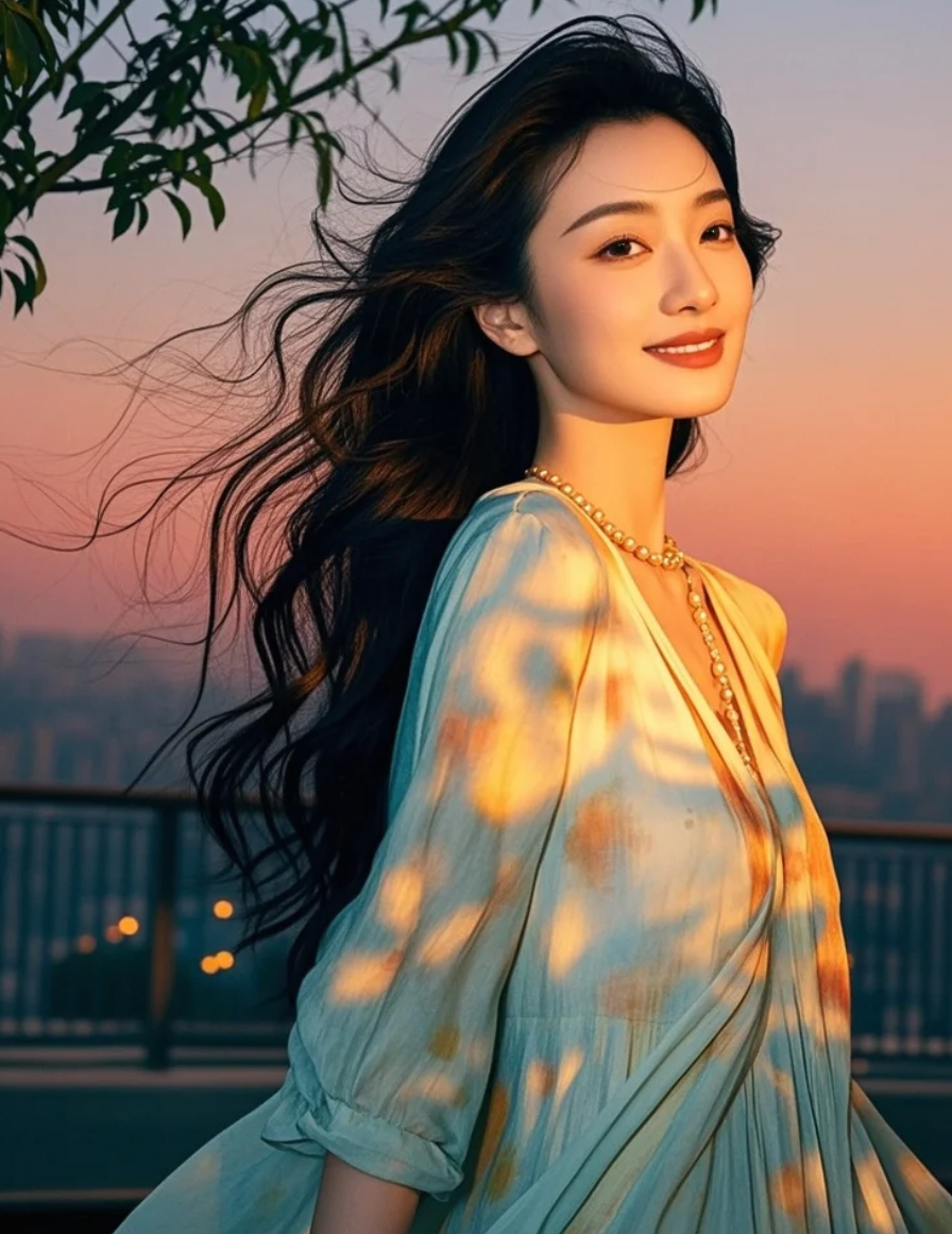 她站在暮色里,长发飘动,笑容如月光般宁静柔和