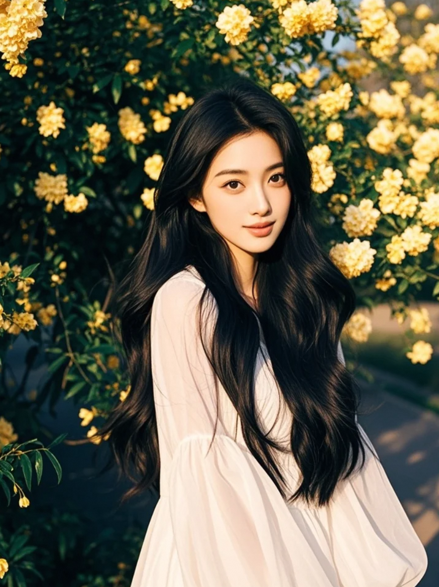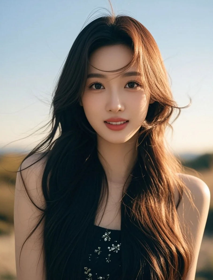 她静立风中,长发飘散,笑容温柔,画面宁静致远