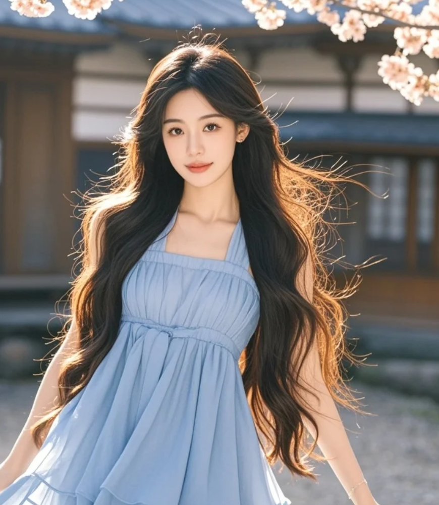 长发飘飘的东方丽人,晚风轻抚,笑容如诗般动人