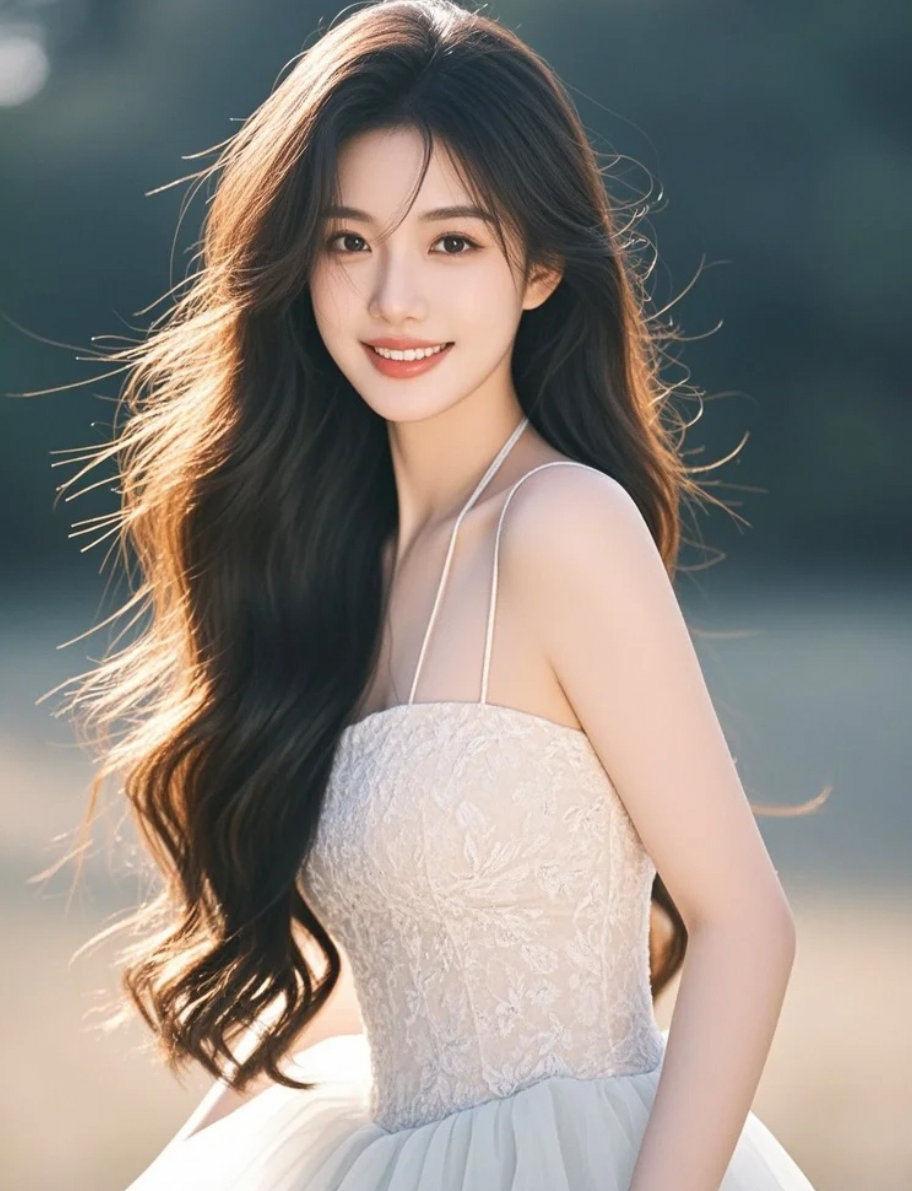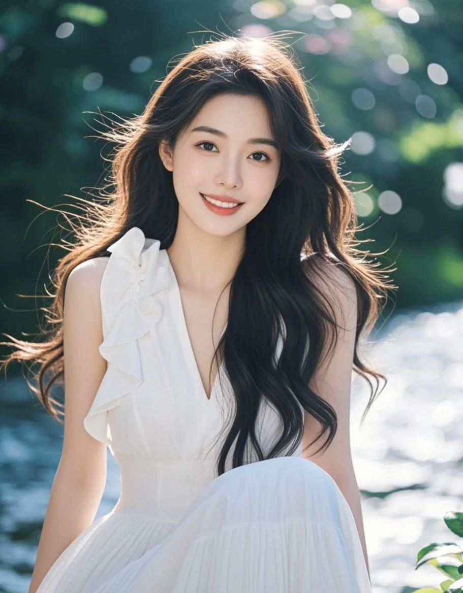 清新脱俗的东方气质,长发与温柔笑容相得益彰