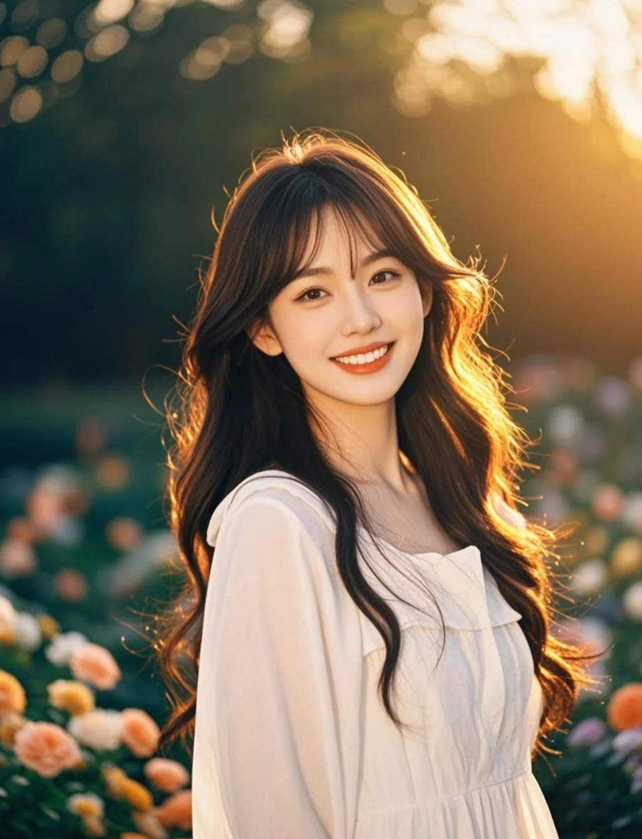 阳光洒落肩头,长发女孩的笑容温暖了微凉的晚风