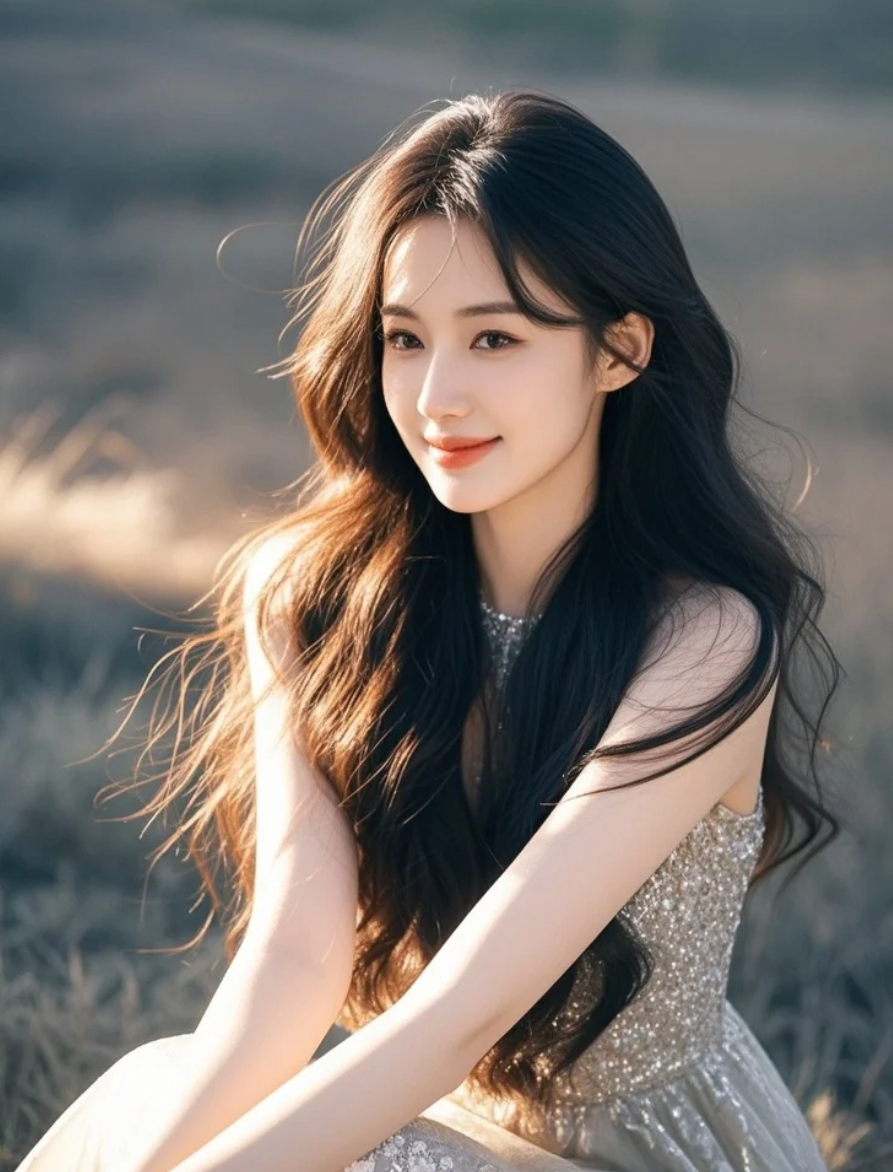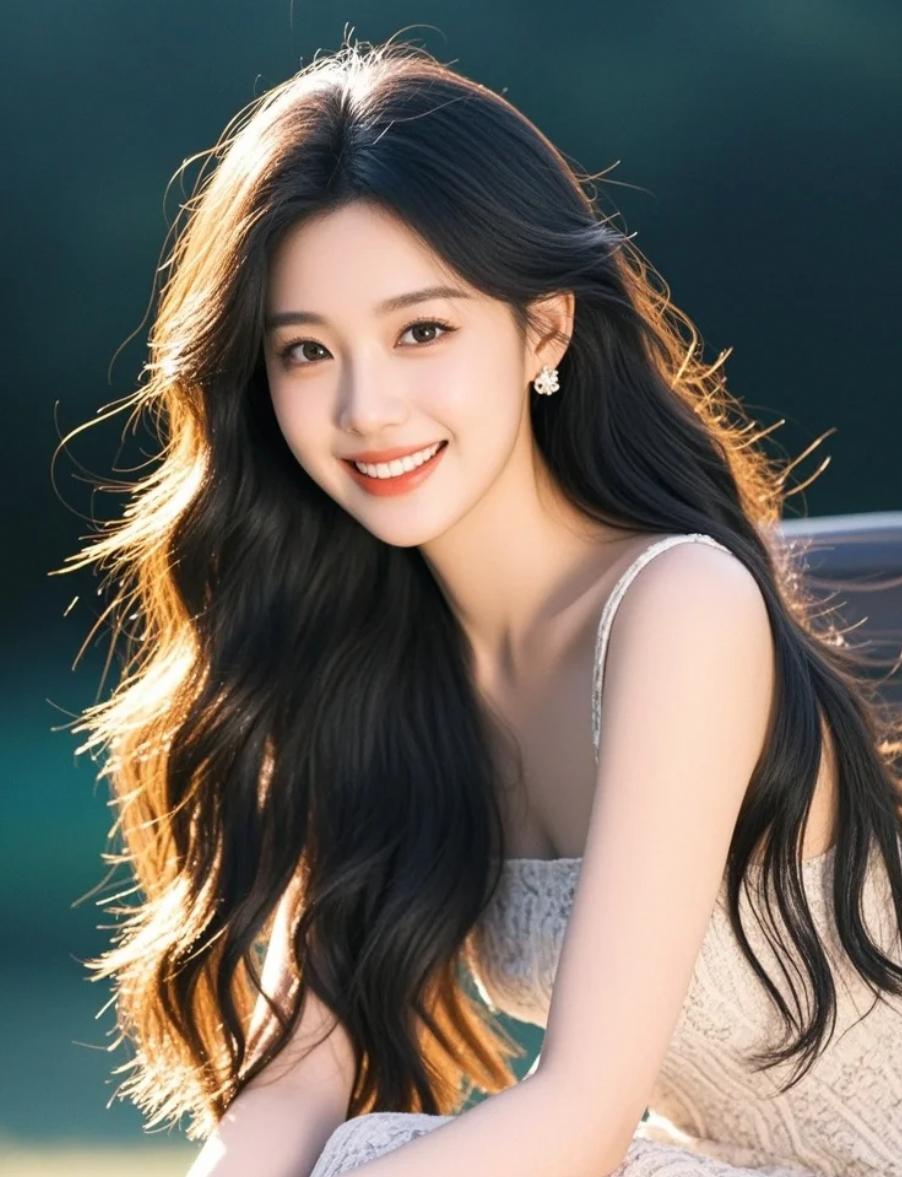 阳光明媚,她长发及背,笑容甜美,姿态优美动人
