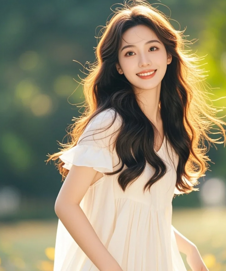 晚风轻拂她的长发,温柔笑容在光影中显得格外柔和