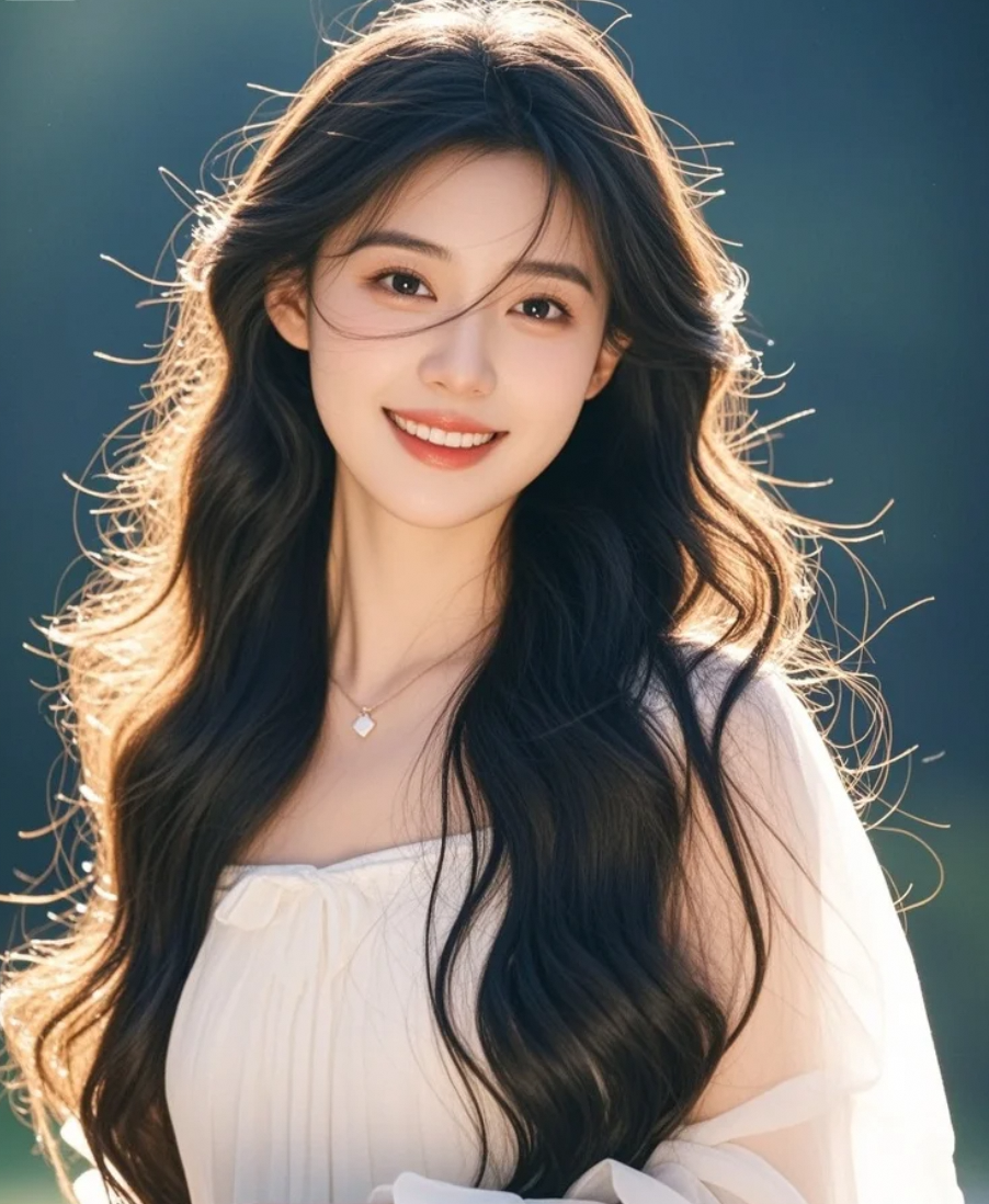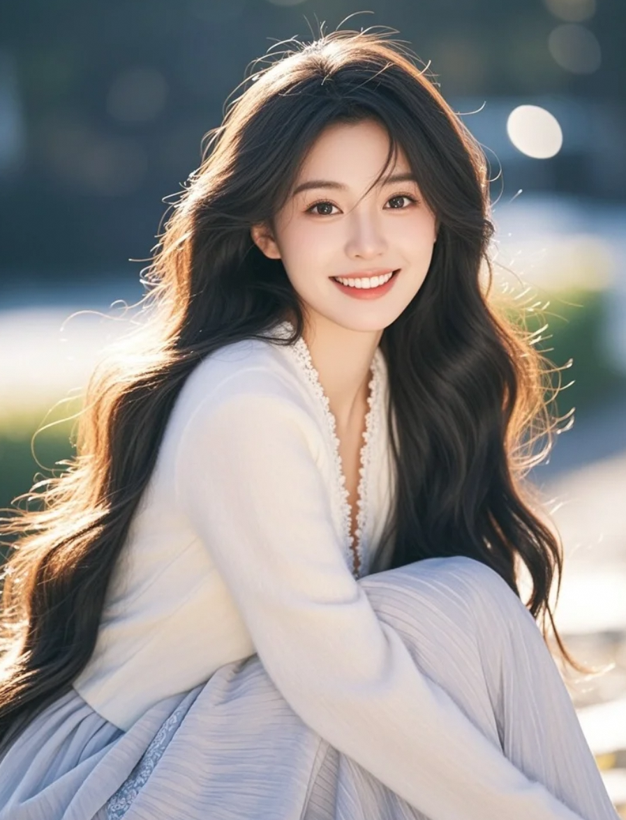 晚风中的优雅倩影,长发与温柔笑容是绝美组合