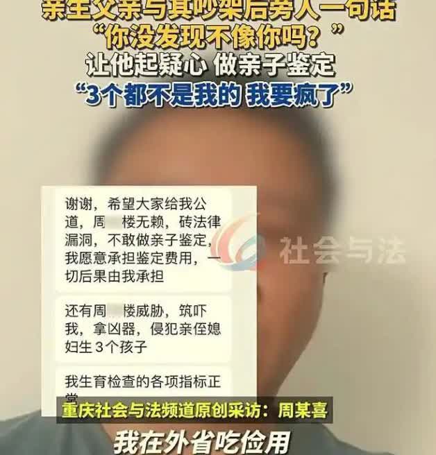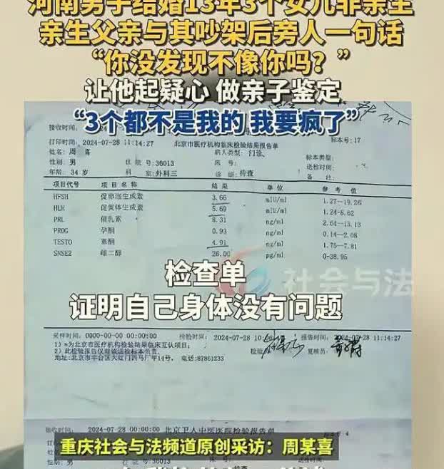 河南,男子结婚13年生了3个女儿,自己任劳任怨在外地打工赚钱养家,结果一次吵架,邻居说了句“你没发现女儿长得不像你吗?”这样男子瞬间懵了,他偷偷带着三个女儿做了亲子鉴定,结果真让邻居说着了,三个女儿都不是他亲生的 老周和妻子结婚十三年,一直在外地打工。每天早起晚睡,省吃俭用,挣来的钱几乎全部寄回家。他总觉得,自己苦一点没关系,只要三个女儿能过得好 大女儿十二岁,双胞胎女儿也九岁了。每次回家,孩子喊他一声“爸”,他就觉得什么都值了 直到去年,一次和二伯吵架后,邻居突然插了句话:你没觉得你几个闺女长得都不像你吗?倒有点像你二伯 说者未必有心,听者瞬间冰凉。老周一个人沉默了好几天,越想越不对劲。他悄悄带着三个女儿去做了亲子鉴定 报告上写得清清楚楚:三个孩子,全都和他没有血缘关系 更让他难以接受的是,周围人早已心照不宣,孩子真正的生父,很可能就是他的亲二伯 去年,老周终于离了婚。而更讽刺的是,前妻离婚后没多久,就直接搬去和二伯住在了一起。为了讨个公道,他要求对方赔偿抚养费。拉扯了一年,最后定下的结果是前妻每年付一万元,直到十五万元结清 从法律角度看,他主张的合理性是有依据的。可问题是,这种事情不是赔些钱,道个歉就能够过去的,三个孩子他一手拉扯大,付出的是真心和父爱,这些记忆抹不掉,可如今知道没有血缘关系,那份爱又被推翻得一干二净 人心不是机器,哪能说断就断,他既放不下孩子,又不得不承认现实,这才是最难过的地方