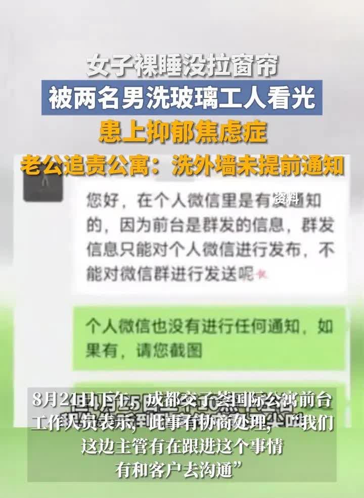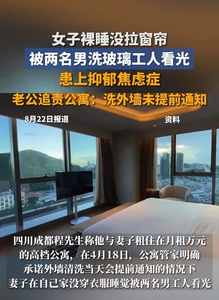 成都两口子万元/月租公寓,今年4月份的某一天,女子在家裸睡,外墙工人洗玻璃,看到了在家裸睡的女子。 女子老公跟公寓管理者讨说法,一是为什么不提前在群里通知?公寓方面回复说这种事不可能发群里,发了个人微信。 女子老公说,既然发微信了,那就截图出来看看。 “我妻子因此已经抑郁症了,有诊疗单”。 公寓方许诺,以后你们若续租,每月减600元。 对这个处理意见,两口子并不同意。 看网友评论,几乎一边倒向着工人,说女子裸睡为什么不盖东西?为什么不拉窗帘?工人爬那么高属于危险工作,人家看你什么呀?再说是早晨,外亮内暗,根本看不清。还有,都一个样,在医院里在医生看来都不算什么的。 还有网友说,这两口子就是想敲诈。 我则不这么看,首先受害者有罪论对女子来说是不公平的,第二,女子老公告的是公寓,因为公寓没尽到提前通知的责任。第三,女人与女人不一样,这个女子自尊心强,心理承受能力差,被陌生男人看到了,接受不了,最后抑郁了,这都是应该可以理解的事,难道不该同情吗?