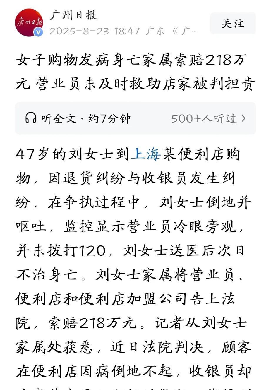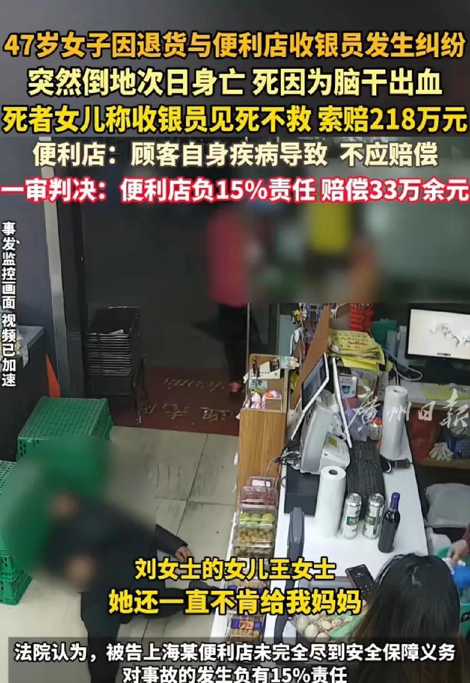 上海,47岁女子到便利店买了啤酒,还没出门又不想要了,要求退款,因为小票的事和收银员发生了争执。过程中,女子情绪激动,突然倒地不起,还呕吐不止,2分钟后,其家人赶到现场拨打了急救电话。谁知第二天,女子不幸去世。女子家人不干了,认为收银员冷眼旁观,没有第一时间拨打120,错过了最佳抢救时间,将收银员和店铺告上法庭,索赔218万。法院这样判。 8月23日,据广州日报报道,2023年11月17日晚上六点多,47岁女子刘某走进了一家便利店,买了几瓶啤酒。 付完款后,还没有走出店门,她突然又不想要了,便走到收银台前,说想要退货。 收银员兰某告诉刘某,按照店里规定,退货必须得提供购买小票。 刘某一听,赶紧在身上翻找,可找了个遍,也没找到小票。她又跑到收银台旁堆满收银小票的垃圾桶里,埋头翻找,可找了半天,还是没找到。 这下,刘某的情绪开始激动起来,大声质问,自己还没离开店呢,凭什么就不能退货退款! 她还挡在收银台前,阻止其他客户结账,非要兰某立刻马上给她退款不可。 兰某只是个打工人,只是按照店里的规矩办事,可她再怎么解释,情绪激动的刘某就是听不进去。 过程中,刘某突然手抓头发,脸上露出极度痛苦的表情,她强撑着给家里人拨打了电话,刚挂断,就“扑通”一声倒地不起了。 兰某瞬间吓呆了,她从来没遇到过这种情况,她想着是因小票而起,便赶紧翻找小票。 两分钟左右,刘某的家人匆匆赶到了现场,当时她已经呕吐不止,家人赶紧拨打了急救电话。 一旁的兰某向他们递过去两块抹布,让他们擦拭刘某的呕吐物,除此之外,她一直站在收银台,没有离开,也没有和刘某有任何肢体接触。 很快,救护车将刘某送到了医院,可不幸的是,刘某还是于次日去世。 刘某的女儿王某悲痛欲绝,她怎么也想不明白,母亲只是要求退个货,怎么就丢了性命呢? 她觉得,母亲倒地呕吐不止的时候,营业员兰某居然不予理会,太过冷漠,这才致使母亲错失了最佳的救援时间。 而且,事发后,营业员和店铺不仅没有垫付相关医疗丧葬费用,连一句道歉的话都没有。 王某越想越气,她觉得母亲不能就这么白白死了,一定要讨个说法。 于是,她一纸诉状,将营业员兰某、便利店及便利店加盟商告上了法庭,要求三被告连带赔偿医疗费、丧葬费、死亡赔偿金等共计218万余元。 法院开庭审理的时候,涉事便利店和兰某都没到庭。 加盟商负责人辩称,王某母亲的死亡原因是脑干出血,因自身疾病造成的,和他们没有关系。 而且,从视频里可以清楚看到,从刘某倒地到家属赶到,只用了两分钟不到,家属已经及时拨打了120,兰某并没有重复拨打,也不存在过失。 毕竟她不是医护人员,担心不当措施会加重刘某的身体损害情况,所以才没有采取其他救治措施。 所以,刘某的死是因为自身疾病导致,退货争议和她的意外不具有任何法律上的因果关联性。 法院会如何判决呢? 本案中,便利店作为经营场所,属于上述法条规定的公共场所,其经营者对进入店内的顾客负有安全保障义务。 刘某在便利店内因退货纠纷倒地不起,收银员兰某未予以积极救助,未及时拨打120或给予其他必要帮助。 而兰某作为便利店员工,其行为代表便利店,因此可认定便利店未完全尽到安全保障义务。 不过,刘某的死亡原因主要是因其自身疾病导致,虽然便利店未完全尽到安全保障义务,但并非直接导致刘某死亡的根本原因。 根据过错程度和原因力大小,法院判定便利店承担15%的责任。 综上,法院最终认定赔偿费用共计1919637.84元,涉事便利店承担15%,赔偿287945.68元。 此外,王某请律师的费用50000元和案件受理费6369.19元,也由便利店承担。 关注@亚伟说法,多学法律少吃亏!