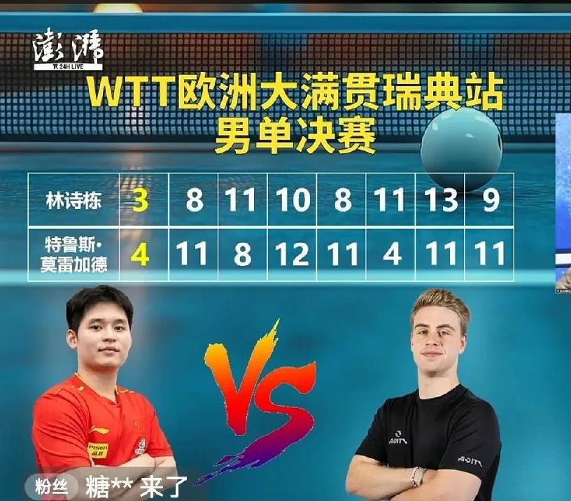 无奈花落去,精彩最后一个球,林诗栋3:4惜败莫雷加德!虽败犹荣,林诗栋,成长必经之路!WTT大满贯瑞典站男单决赛已经结束,中国乒乓球队名将林诗栋对阵德国名将莫雷加德,林诗栋最终3:4失利,比分分别为8:11,11:8,10:12,8:11,11:4,13:11,9:11。其中最后一个球,打出高峰,林诗栋在莫雷加德狂轰乱炸中,接连救起来球,展现出高超的技战术,虽败犹荣!