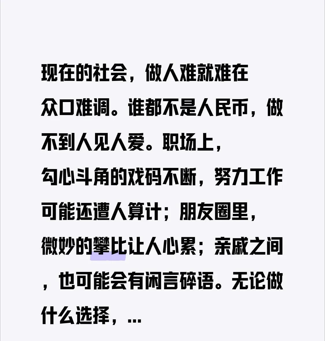 现在的社会,做人难就难在众口难调。谁都不是人民币,做不到人见人爱。职场上,勾心斗角的戏码不断,努力工作可能还遭人算计;朋友圈里,微妙的攀比让人心累;亲戚之间,也可能会有闲言碎语。 无论做什么选择,总有人指指点点;哪怕做得尽善尽美,也会有人挑刺。我们一边要照顾别人情绪,一边又得兼顾自己的。与其在别人的评价里患得患失,不如遵从内心,专注自己的幸福,活出真正的自我。