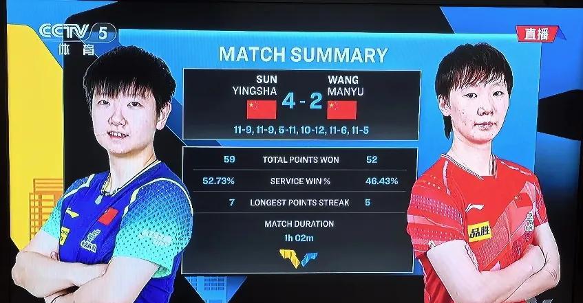 神仙打架,你希望谁赢?WTT欧洲大满贯瑞典站女单决赛开始了,决赛的两名选手是世界排名第一的孙颖莎与世界排名第二的王曼昱,神仙打架,说的一点也不过分。王曼昱发球,第一分就形成了多拍,看来双方准备的都很充分,1:3,王曼昱领先两分,1:4,孙颖莎机会球打丢了,2:4,3:4,这两分孙颖莎反手特别强势,4:4,6:5,7:5,孙颖莎反超两分,7:6,8:6,双方争夺的相当激烈,8:7,王曼昱高质量的变线,9:7,9:8,双方针尖对麦芒,10:8,孙颖莎拿到第1局的局点,10:9,反手位强对抗,太精彩了,11:9,孙颖莎先胜一局,第1局双方都发挥了水平。第2局,3:1,孙颖莎领先,4:1,4:2,双方控球的质量都非常高,彰显了基本功的扎实,4:3,5:3,又是一个精彩的多拍球,孙颖莎打了一个发抢,6:3,6:4,王曼昱高质量的拉球,6:5,打的太精彩了, 7:5,7:6,8:6,孙颖莎是一分也不放,8:7,8:8, 8:9,王曼昱反超一分,9:9,双方互不相让,现场一片惊叹,10:9,孙颖莎先拿到局点,11:9,孙颖莎拿下第2局,大比分2:0领先王曼昱,第2局双方打了都很好,输赢就在一两分之间。5:11,王曼昱扳回一局,这一局孙颖莎的发球没有处理好,第4局,10:12,双方打成2:2平,乒乓球能打成这样,也只有在中国顶尖选手之间才会这么精彩,叹为观止。第5局,9:5,孙颖莎领先,10:5,王曼昱反手拧拉失误,10:6,11:6,孙颖莎拿下第5局,3:2领先王曼昱。第6局开始,2:0,孙颖莎真强势,3:0,王曼昱请求暂停,3:1,王曼昱暂停起到效果,4:1,又是强强对抗,4:2,5:2,6:2,他们俩太熟悉了,任何一方质量略微低一点,就被反杀,7:2,比分拉开,7:3,又是一个精彩的回合,让球迷直呼过瘾,7:4,继续神仙打架,8:4,9:4,压力来到王曼昱这边,9:5,10:5,孙颖莎拿到冠军点,11:5,4:2孙颖莎拿到冠军。这场比赛录像外协会球员可以反复观看。