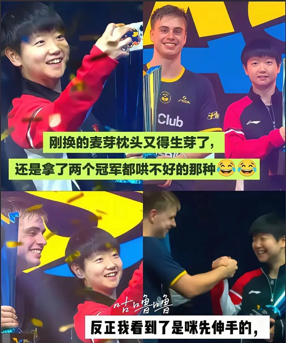 流水的男单冠军,铁打的万分女王!这次小莫夺冠,莎莎大大方方先伸手祝贺,小莫笑得满脸都是牙! 上次世界杯,雨果打败王楚钦夺冠,莎莎上台一副要干架的样子,合影都没多少笑意。这次小莫打败小石头,莎莎笑得很灿烂,看来莎姐也认可小莫,干干净净打球,赢了小石头也值得尊敬。 不得不说,莎莎这次又得了大赛美貌综合症。这么漂亮的奖杯,她一连拿回来俩,瑞典真是福地啊。网友说,东八区哥哥的麦芽枕头又发芽了,真是太有梗了!实际上那颗大头一定又思念,又骄傲吧。[飞吻][飞吻] #孙颖莎# #你喜欢孙颖莎吗# #国乒##王楚钦# #王楚钦孙颖莎# #莎头# #国球乒乓王楚钦# #瑞典大满贯#