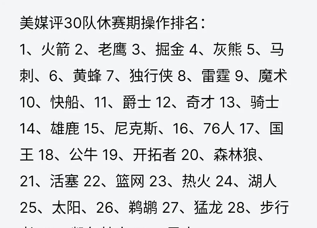 这不是扯吗 凯尔特人第29? 美媒评NBA休赛期操作榜:火箭登顶,勇士垫底 近日,美媒发布新赛季NBA30队休赛期操作排名,榜单格局引发热议。 火箭凭借休赛期关键引援与阵容优化位居榜首,成为最大赢家。快船排名第10,操作评价中规中矩。湖人则仅列第24位,休赛期动作未获认可。 最受关注的是凯尔特人位列第29,勇士以第30名垫底,两大强队的休赛期表现被美媒评为联盟最差梯队,这样的排名与两队过往实力定位形成反差,引发球迷广泛讨论。