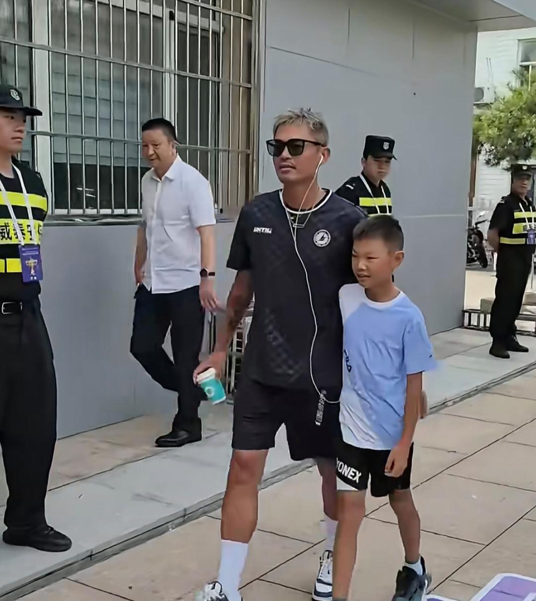 林丹和儿子一起现身球馆,父子俩搭着肩走路,看起来好亲近。儿子小小年纪染了银发,但