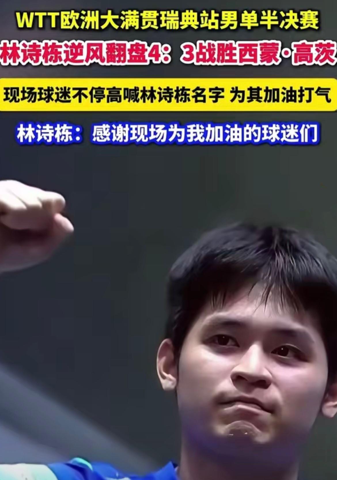 林诗栋拼到了最后一刻,赢下了这场硬仗。 在乒乓球赛场上,落后的局面往往会给选手带来巨大压力。林诗栋在1-3落后且小分1-4时很多人觉得他翻盘无望,可他没被困境吓倒,顶住压力以11-8逆转。这勇气就值得称赞。 小石头没有盲目死磕,而是理智地调整心态。这是一种非常难得的能力,在紧张的比赛中,能迅速冷静下来,重新规划战术,为后续的逆转奠定了基础。 第六局,又6-9落后,就差2分输掉比赛的时候,林诗栋连拿5分,以11-9拿下第六局,将比赛拖进决赛局! 第七局,开局领先,被西蒙一路咬住追至7-5,最后关头把握住,以11-7拿下第七局!林诗栋最终以4比3艰难实现逆转。充分展现了他的实力和智慧。这一系列操作都彰显着他在比赛中的成长与成熟。 林诗栋身上的拼劲就像一团火焰,燃烧在赛场上。通过这场比赛,他的心理素质又上了一个台阶,期待他的决赛更加耀眼。看着西蒙失落的表情,深感每一个运动员都很不容易,竞技体育就是这么残酷。