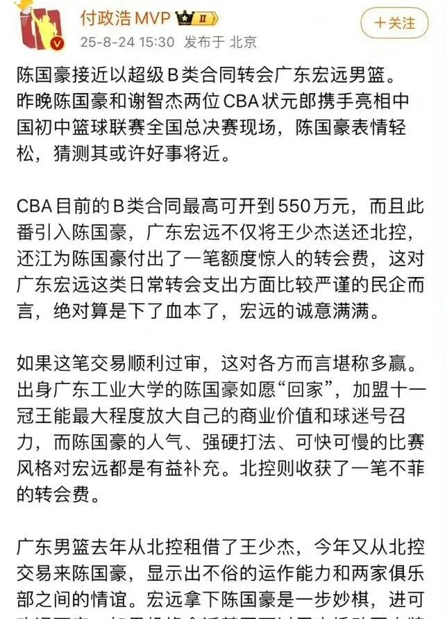 陈国豪将正式加盟广东,朱芳雨付出了3个代价:今日,据CBA媒体人报道,北控锋线