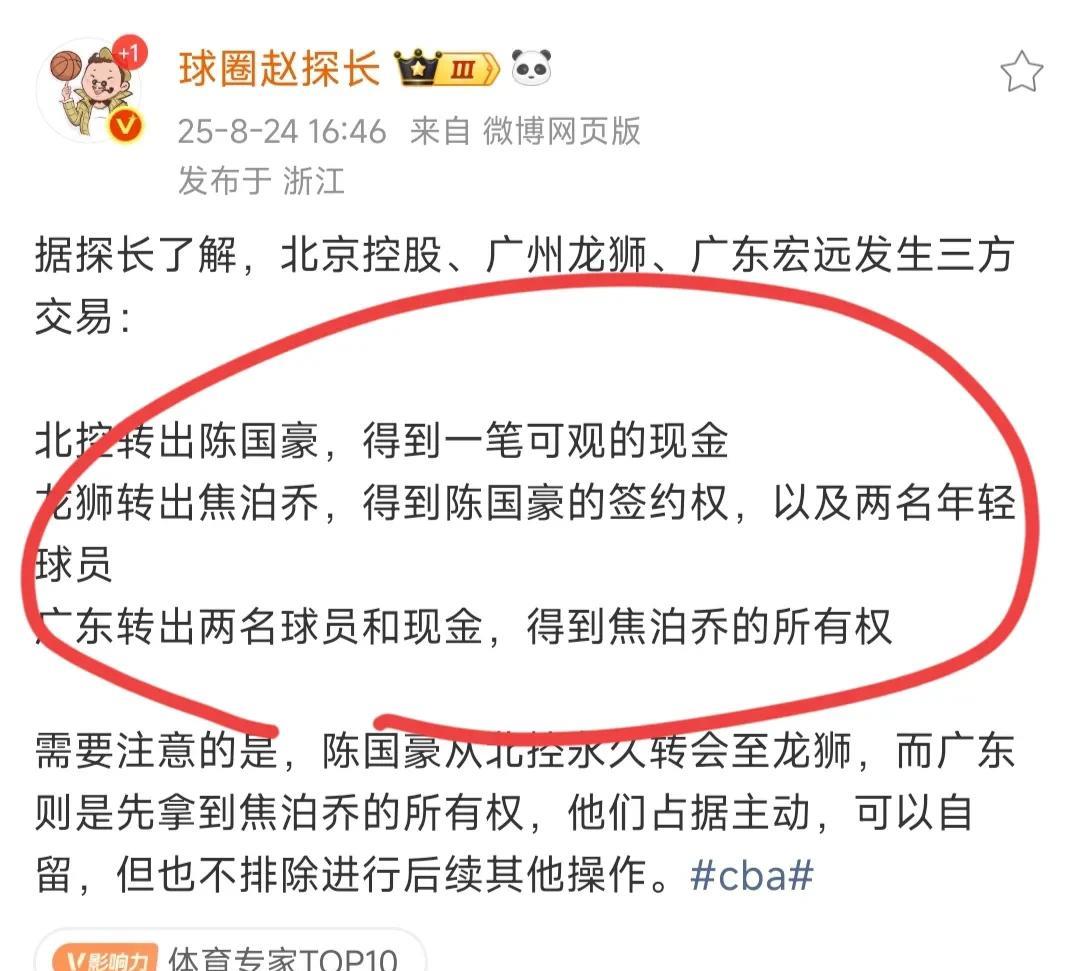 cba这是要上演《三国演义》转世!广东先和北控交易到陈国豪后,选择向上继续交易,最终目标是龙狮的五号位焦泊乔,也不排除继续交易可能性,或许还有大鱼!北控这是要转型当“点钞机”了,召回王少杰,得到一笔巨额转会费,而龙狮成球员“转会中介”!焦泊乔加盟广东后,徐昕必须走啊,要不然新赛季12人名单都费劲,付政浩和赵探长两个媒体人报道情况不一致,主要差在,赵探长是付政豪的后续报道,交易继续进行了!