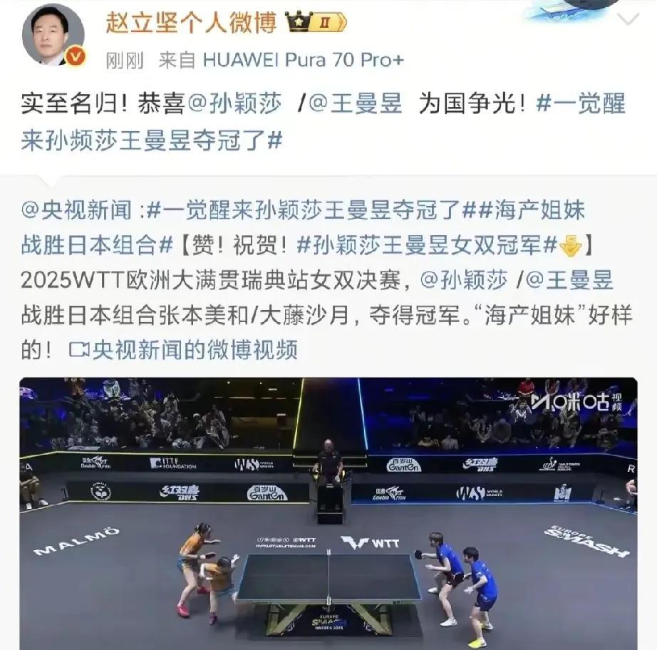 海产姐妹夺冠,女队团魂炸裂!莎莎说,不只是她和曼昱在战斗,整个团队都在为他们加油。特别是赛后抛球给观众环节,佳佳同同大迪钱钱都笑得合不拢嘴,高喊莎莎她们也要签名球,把莎莎都整害羞了! 女队一直纠缠于各种争名夺利的不合传闻,这次海产姐妹打败日本组合张本美和/大藤沙月夺冠,不止提振团队士气,还展示了团结一心、欢乐和谐的团队氛围,这比金牌更珍贵!外交部坚哥第一时间恭喜海产夺冠!